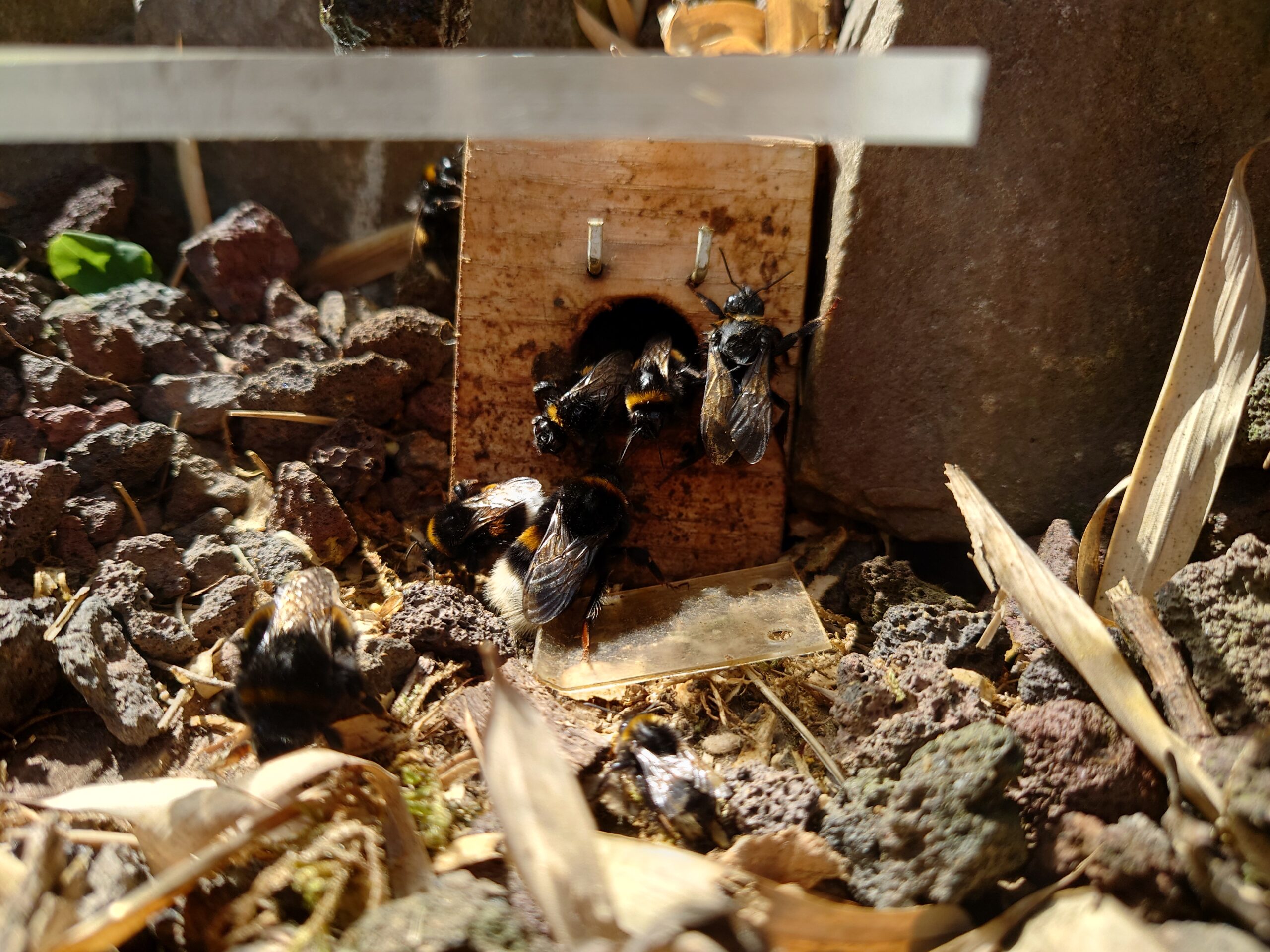 -Einblick in das Erdhummelnest und Gewimmel vorm Eingang – da wird sogar ab und an die Wachsmottenklappe ausgehebelt.