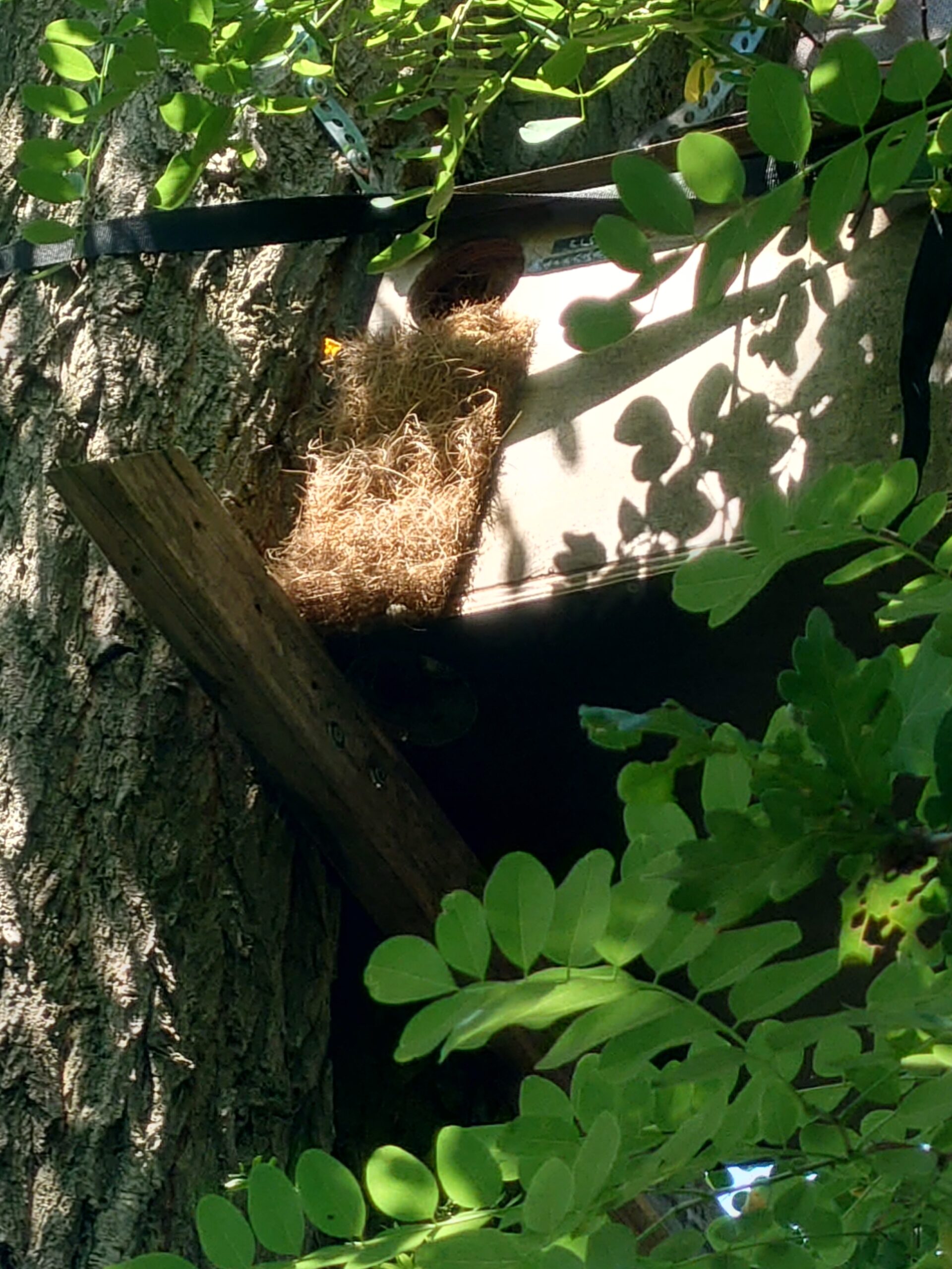 Ist auch gar kein Problem, das die Hornisse unseren Holzkasten geschnappt hat, wir haben bereits den selbstgebauten Kobel vom Eichhörnchen in einer hohen Eiche entdecken können. Seit 2 Tagen scheint es ihr aber zu warm zu sein, um zur Futterstelle zu kommen. Der Schweif schaut ab und an aus dem Kobel raus, aber die drückende Hitze wird ihr stark zusetzen. Vielleicht bleibt sie dieses Jahr – wir würden uns freuen.