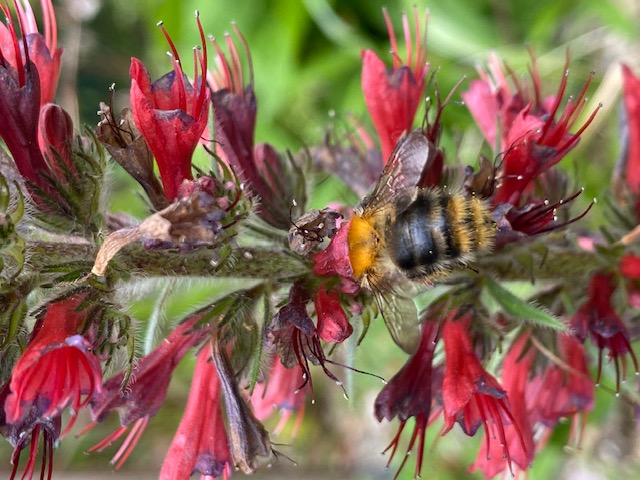 Im Garten blüht eine selbstgezogene Ochsenzunge (deren Schwester hat das Gärtnerhörnchen auf dem Gewissen) und wird schon von den Ackerhummeln angeflogen.