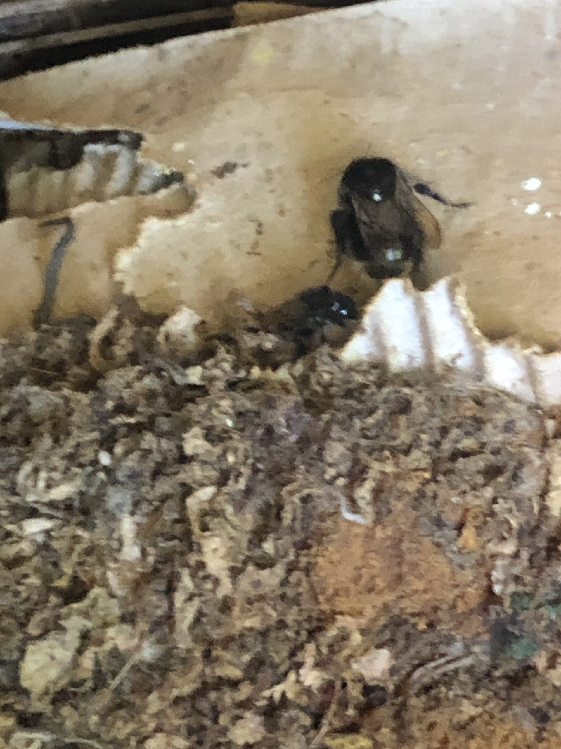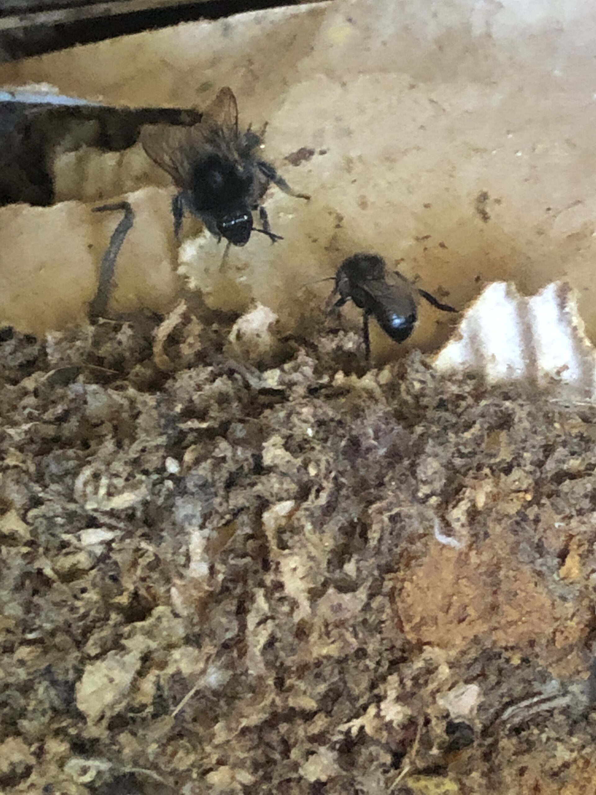 Larven hab ich keine gesehen, es sind mehrere Wachsmotten im Kasten, sitzen auf dem Nest. Es scheinen auch noch Jungköniginnen im Nest zu sein, da mehrere Drohnen den Kasten ständig belagern.
