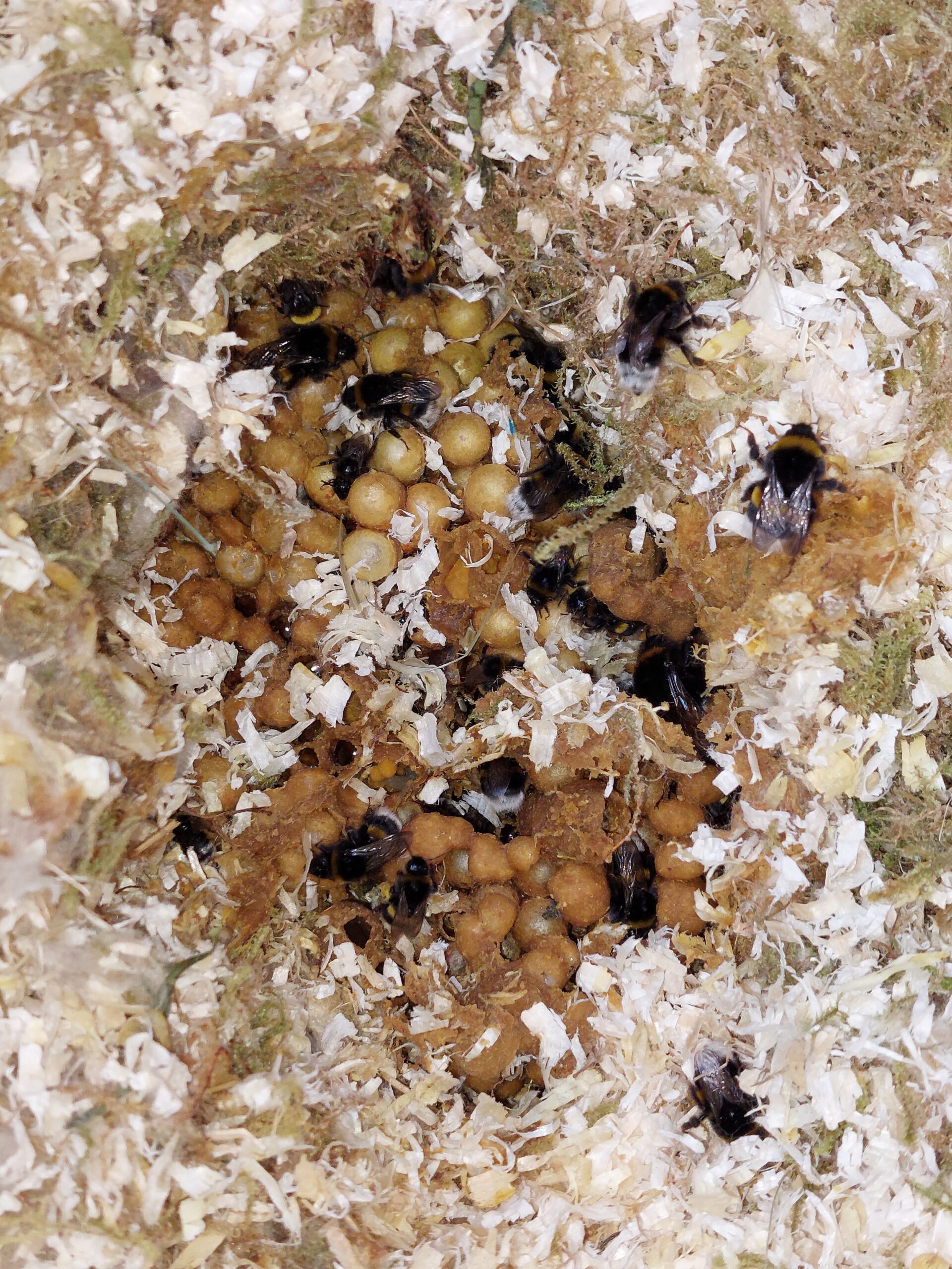Das Erdhummelnest sieht gut aus und dürfte unter dem Nistmaterial verborgen um ein vielfaches größer sein. Super!