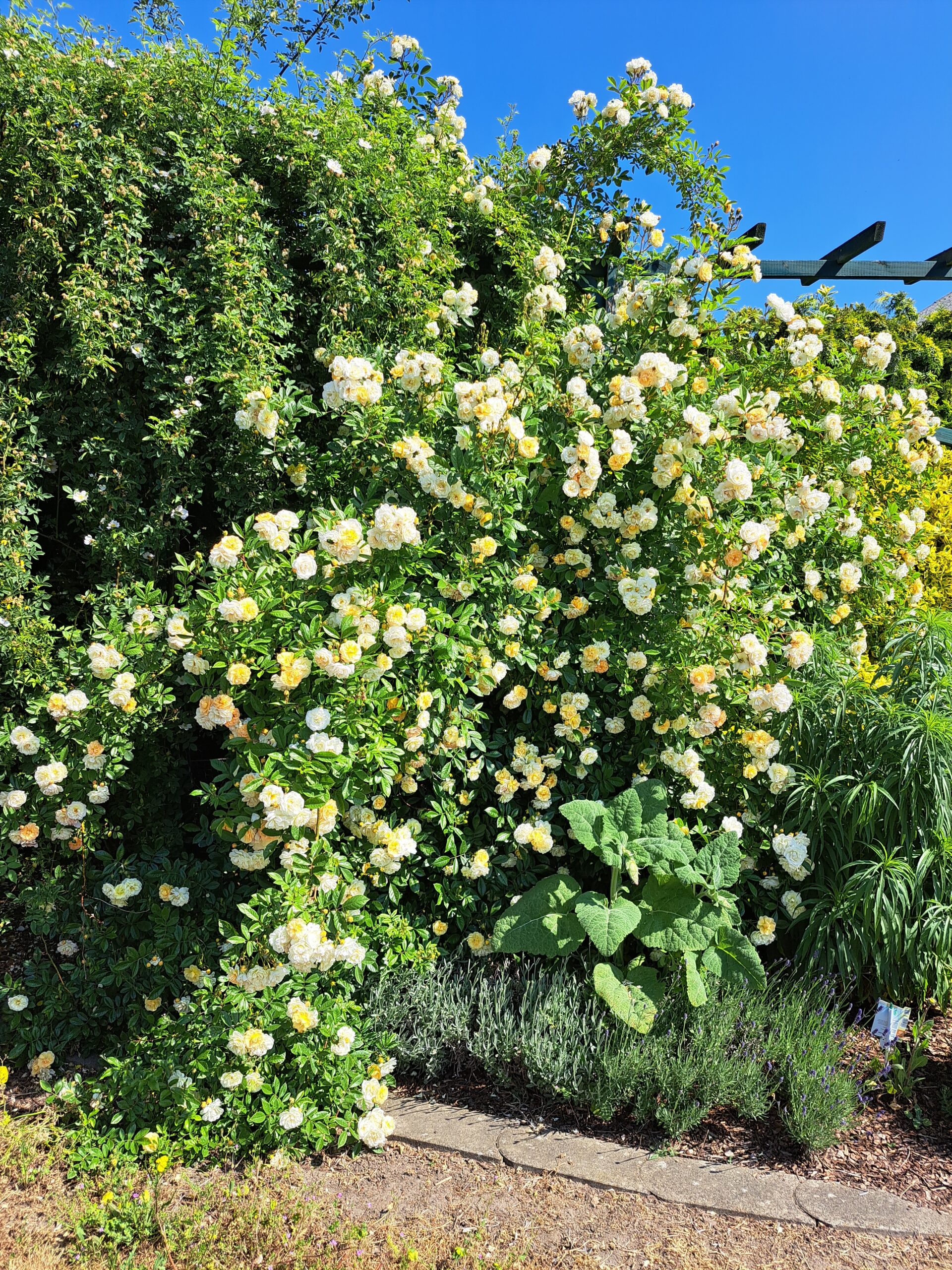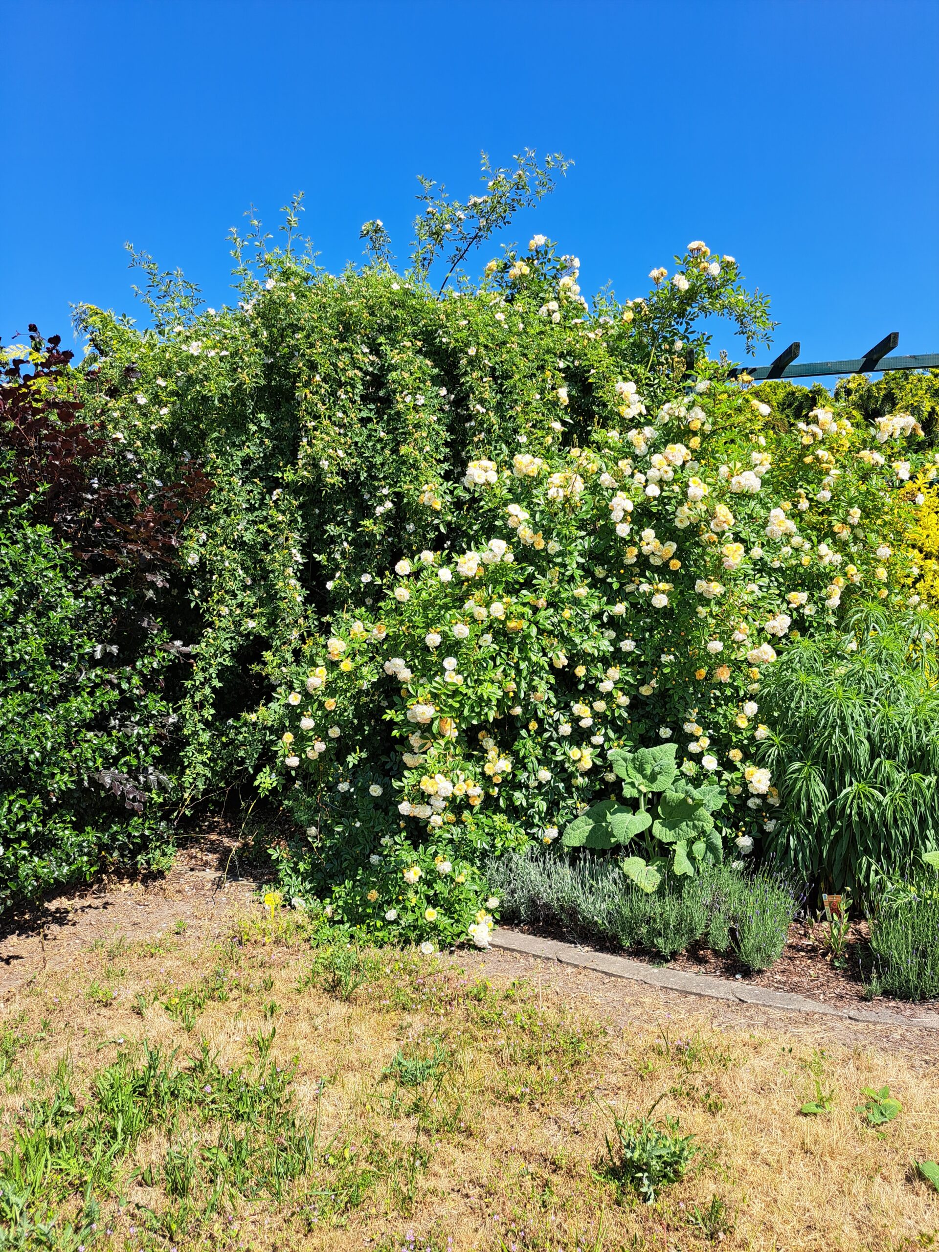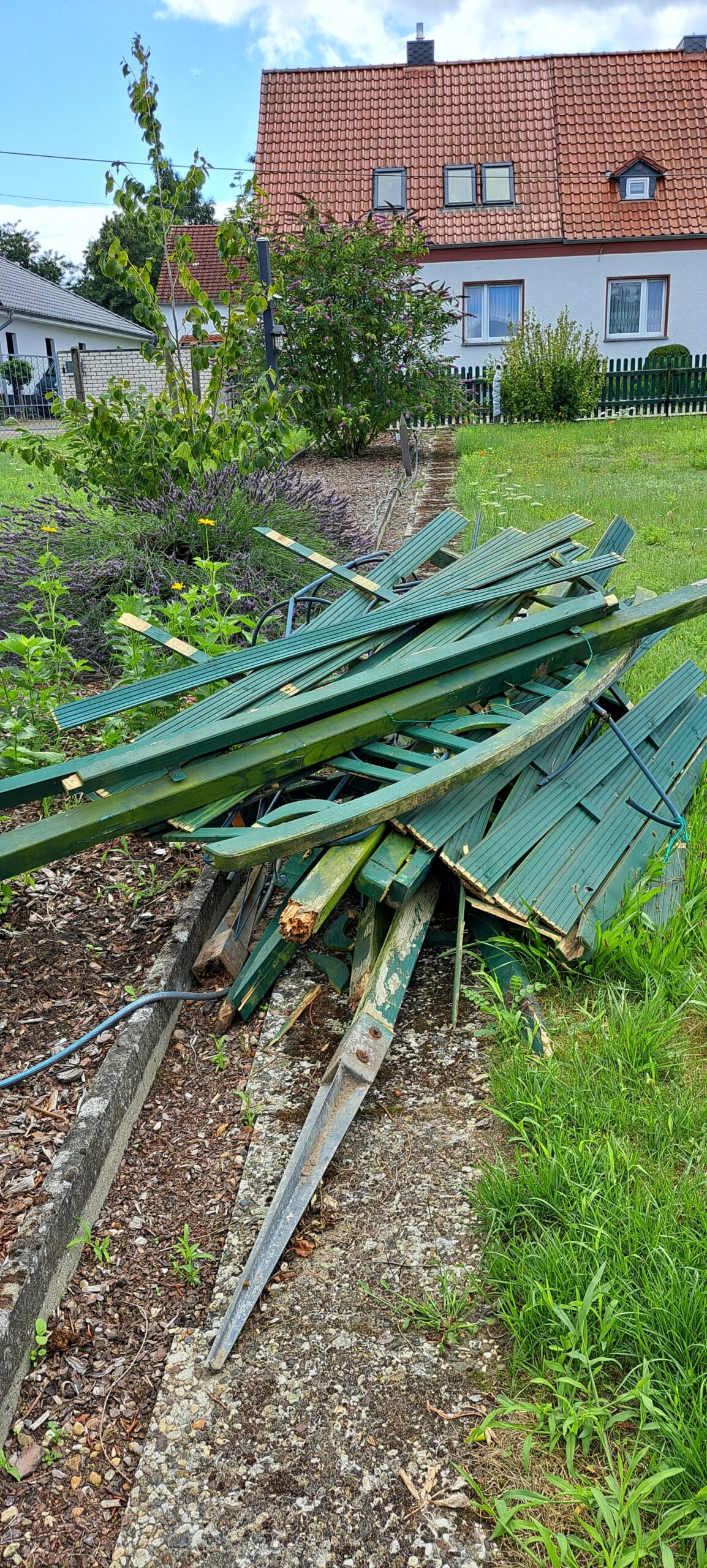 Beim letzten Sturm hat es leider meine große Pergola im hinteren Gartenteil erwischt. Wildrose und Ramblerrose sind leider nicht zu retten gewesen. Die Kletterhortensie habe ich stutzen müssen. Sie bekommt eine neue Rankhilfe. Wird sich wieder erholen.