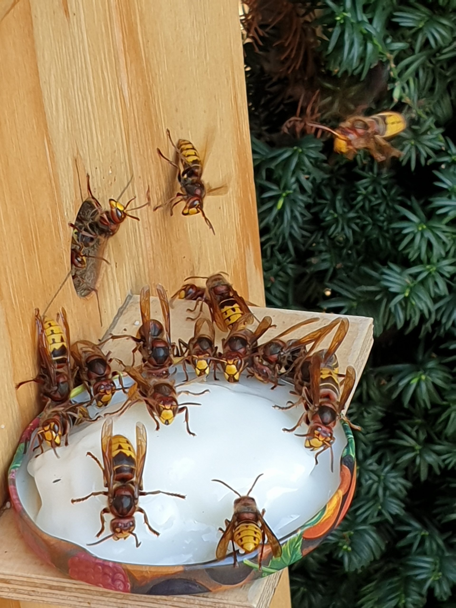Hornissen, ja die Riesen Brummer hatten wir unterm Dach, hab sie da auch wohnen lassen obwohl das Schlafzimmer Fenster direkt daneben liegt, wir sind aber gut Miteinander ausgekommen. Man konnte auch ohne Probleme auf den Balkon gehen.