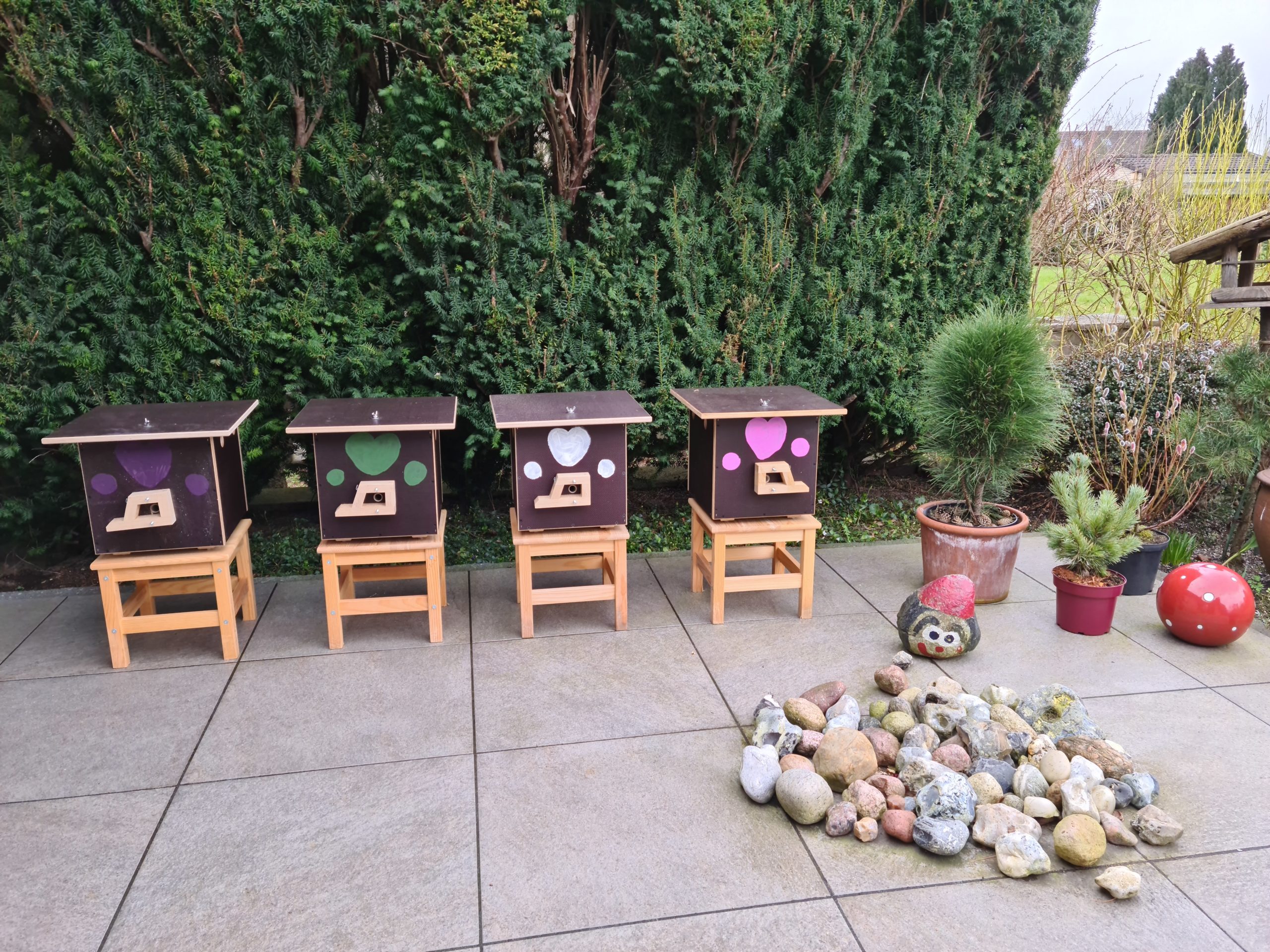 Es werden ja eh jedes mehr Hummeln und Häuser. Jetzt stehen vier da, + die drei alten im Keller + zwei, die ich noch dazubekomme. Vier Häuser verleihe ich (und hoffe, ich kann die Empfänger auch für Hummeln begeistern).