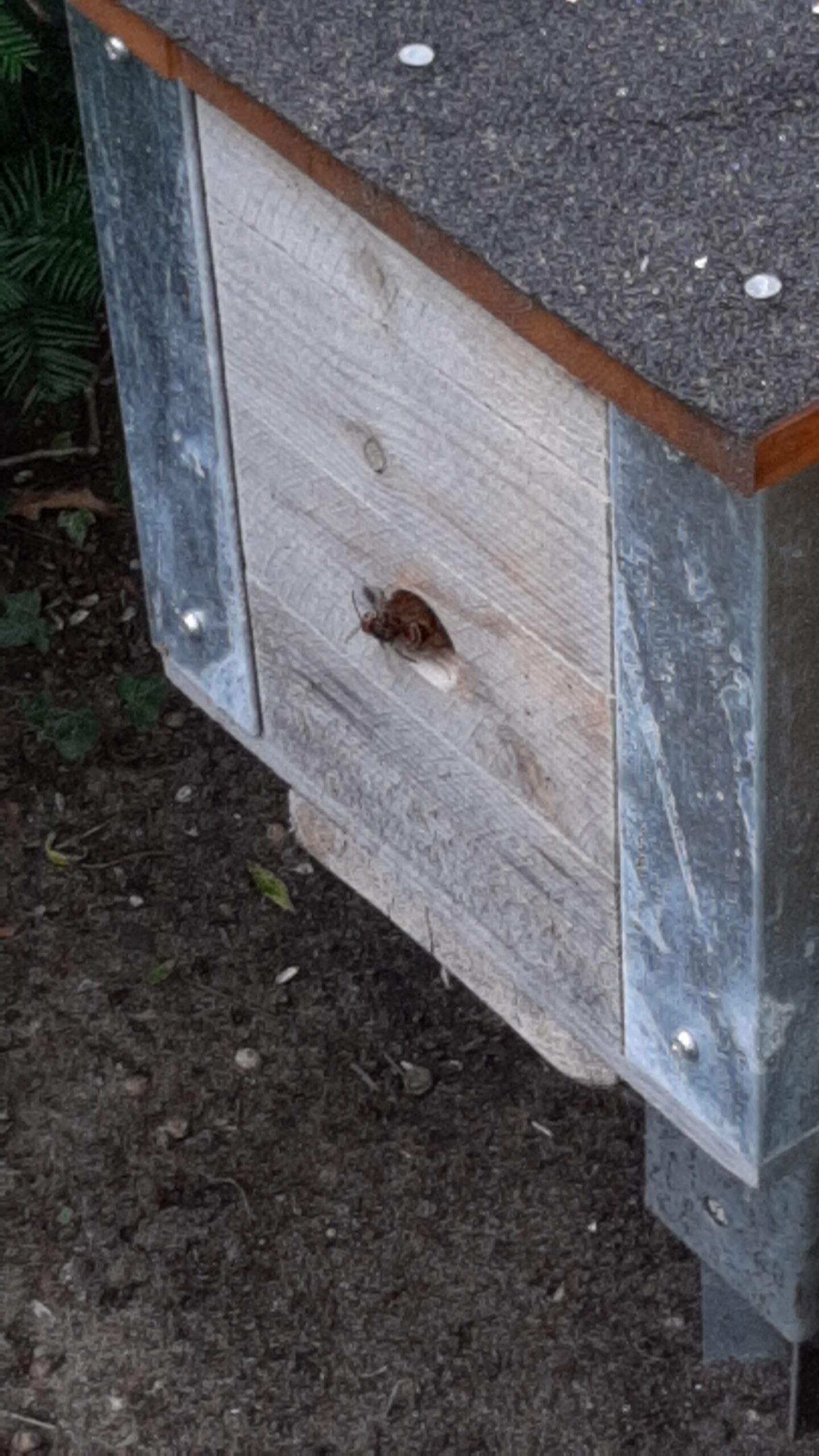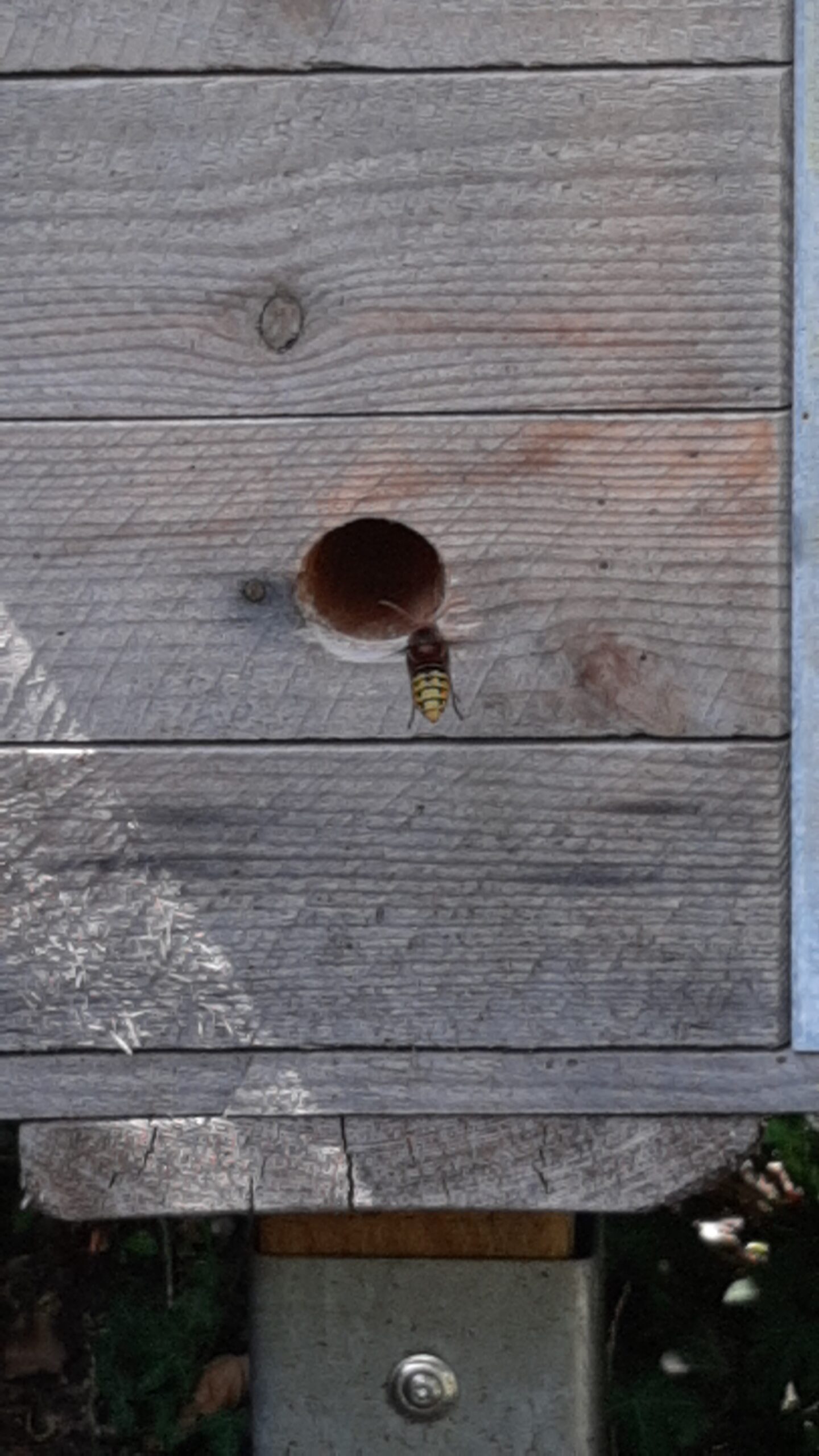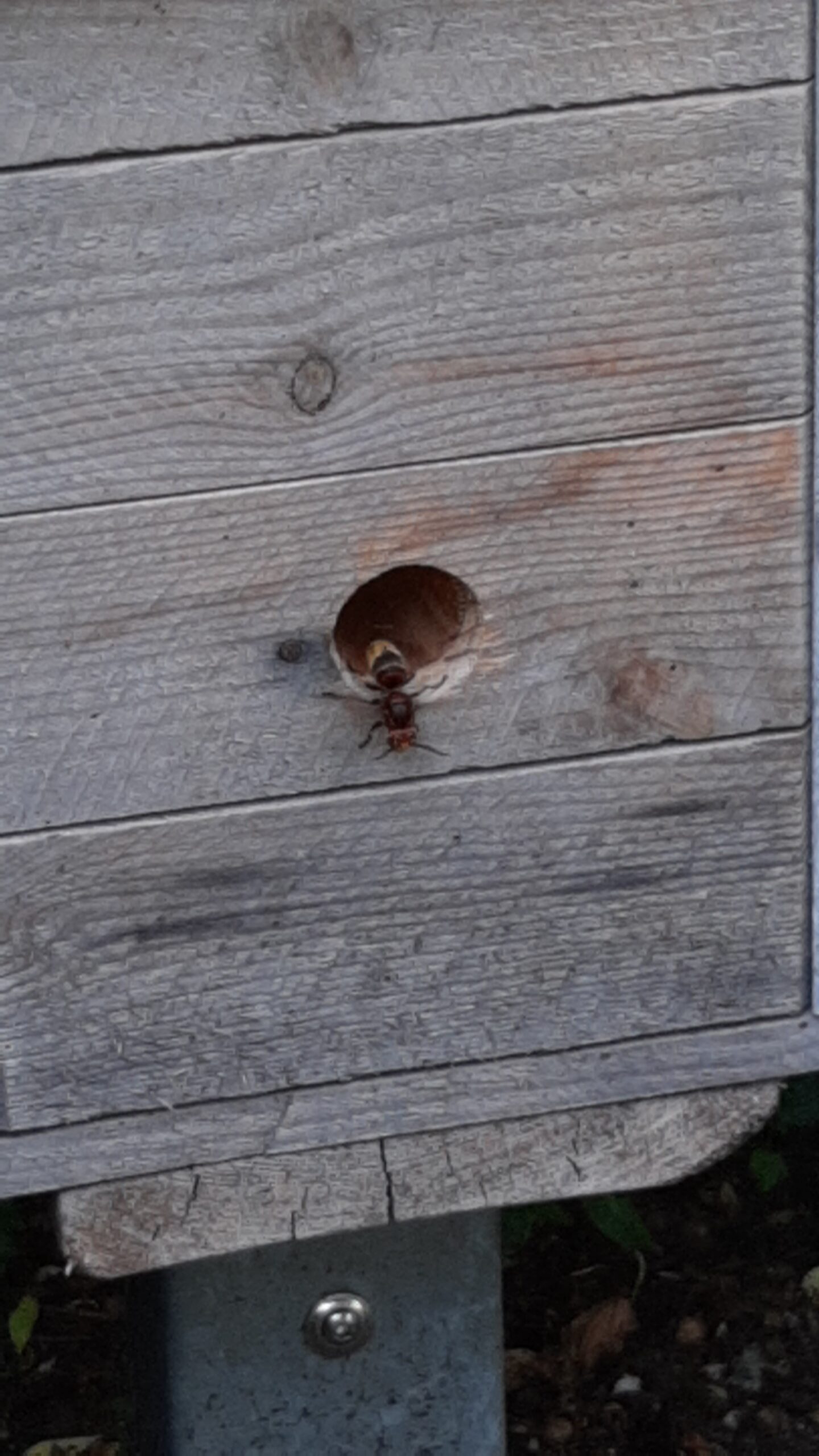 Hornissenkönigin fliegt weiter ein und aus. Erste Arbeiterinnen gesichtet. Die benutzen einen anderen Eingang, ein ca. 3 cm großes Loch von oben. Der Seiteneingang der Königin ist rd. 25-30 cm entfernt. Wie lange fliegt die Königin noch mit aus? Wie bei den Hummeln rd. 8 Tage?