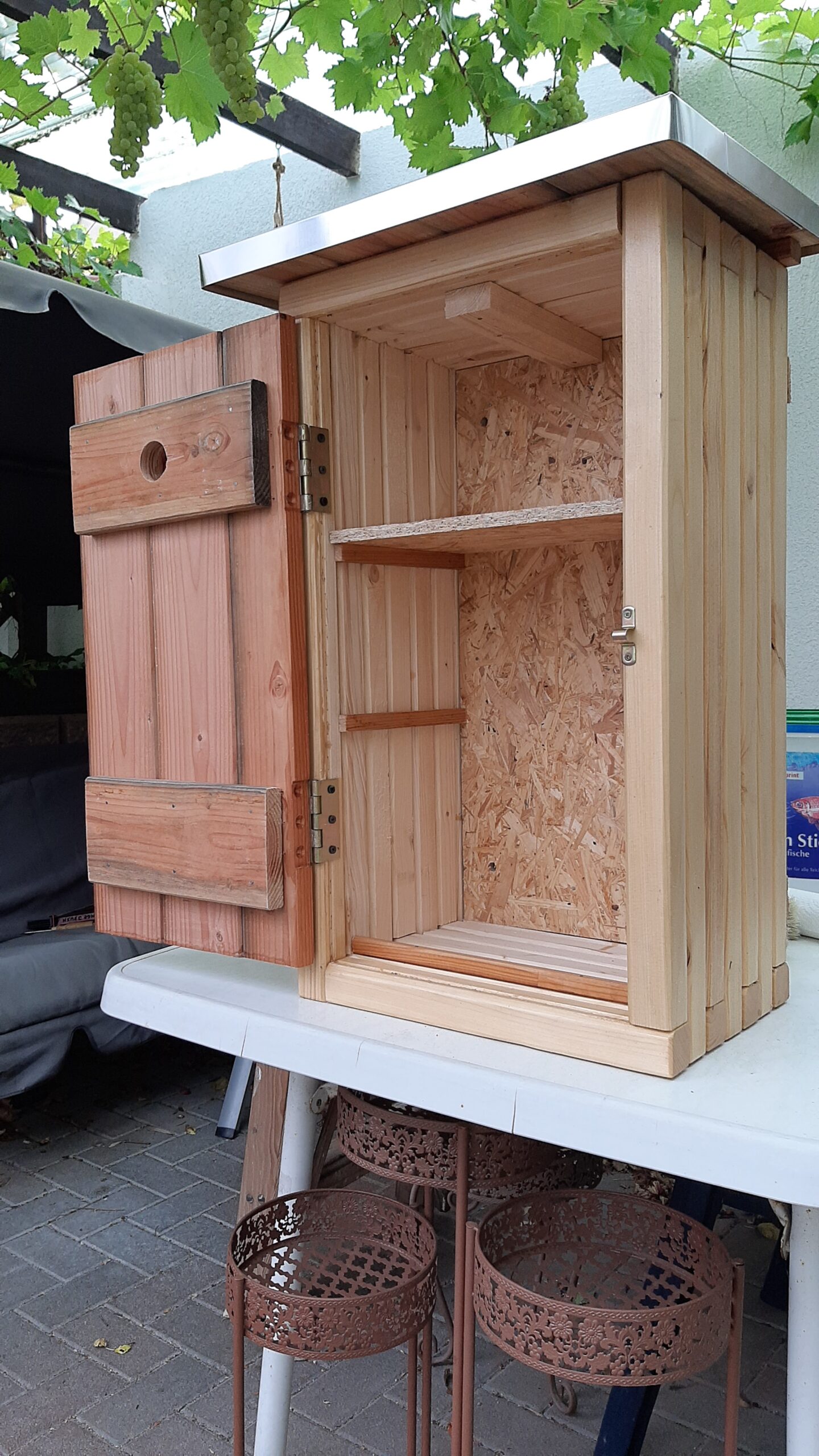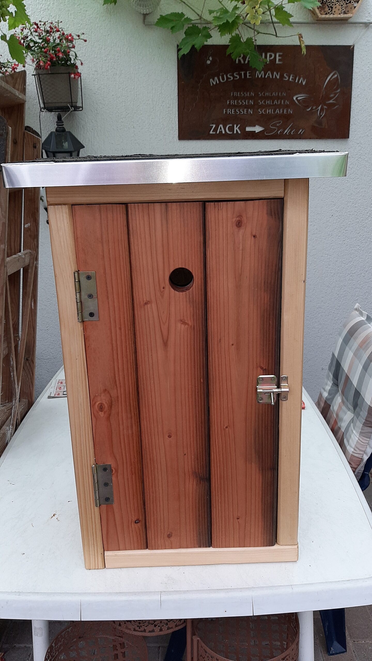 @Wolli – der Korpus ist ein fertiger Pflanzkasten aus dem Internet aus Nadelholz. Eigentlich war Hartholz mein Wunsch aber ich habe nichts entsprechendes gefunden. Tür und Dach sind aus Brettern für den Außenbereich aus dem OBI-Baumarkt. Der Kasten wurde außen zweimal mit einem Holzschutzmittel auf Naturölbasis gestrichen. Bezüglich der Haltbarkeit kann ich gerne weiter berichten.