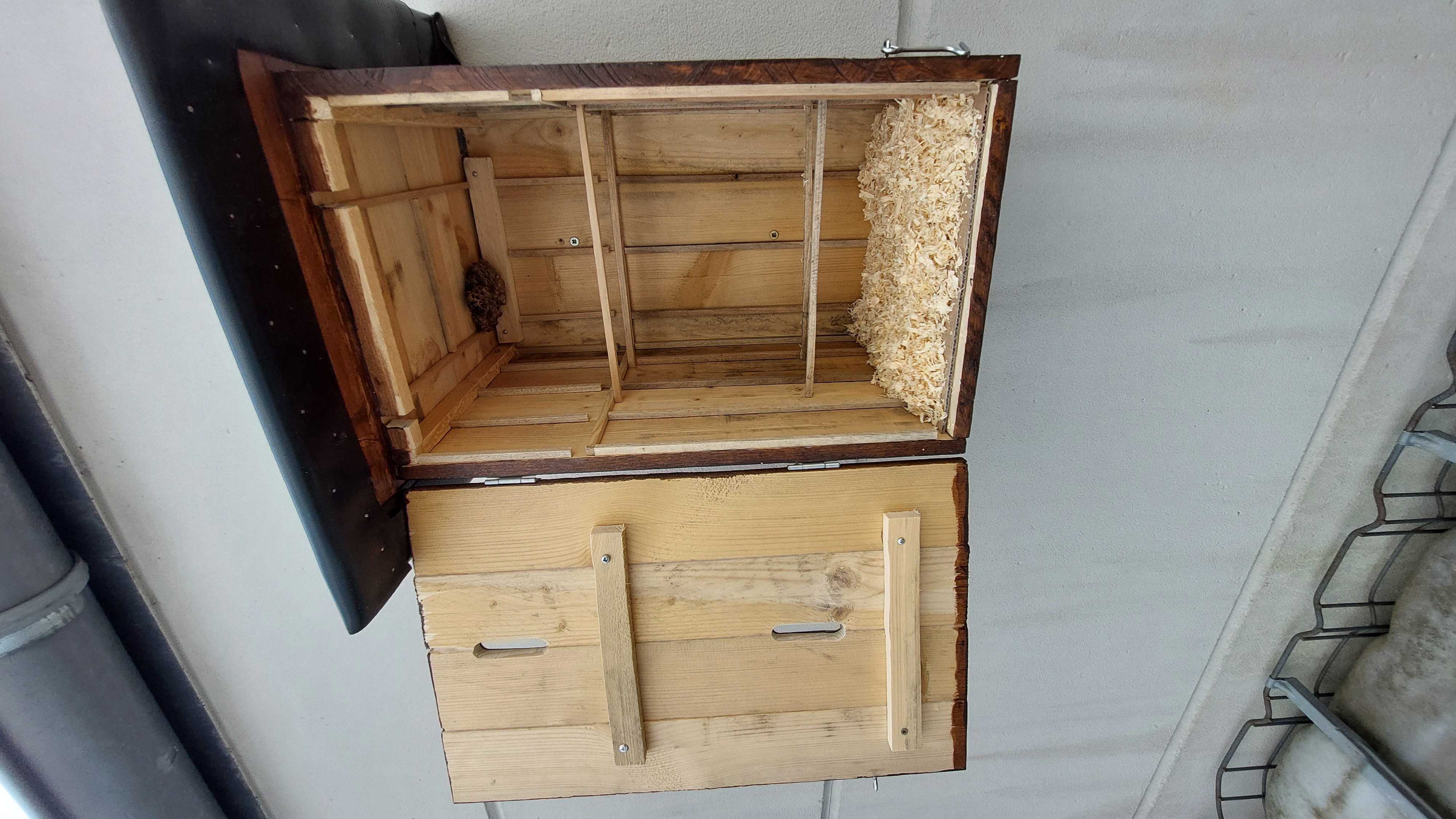 Ich hatte im Frühling einen Hornissenkasten nach der Anleitung für den Mündener Hornissenkasten gebaut. Diesen habe ich innen noch etwas umgebaut, indem ich Holzplatten entnehmen kann, wenn das Nest größer wird. Diesen hatte ich Mitte April angebaut. Nun habe ich heute entdeckt, daß tatsächlich eine Hornisse hier eingezogen ist. Das ist echt unglaublich und ich habe keinerlei Erfahrung mit den Hornissen. Habe aber jedes Jahr hier suchende Königinnen gesehen und möchte diese hier auch unterstützen. Anbei ein paar Fotos vom Kasten und dem neuen Nest. Die Hornisse kann noch nicht lange hier sein. Hat jemand vielleicht ein paar kleine Tips und Erfahrungen was mich erwartet?