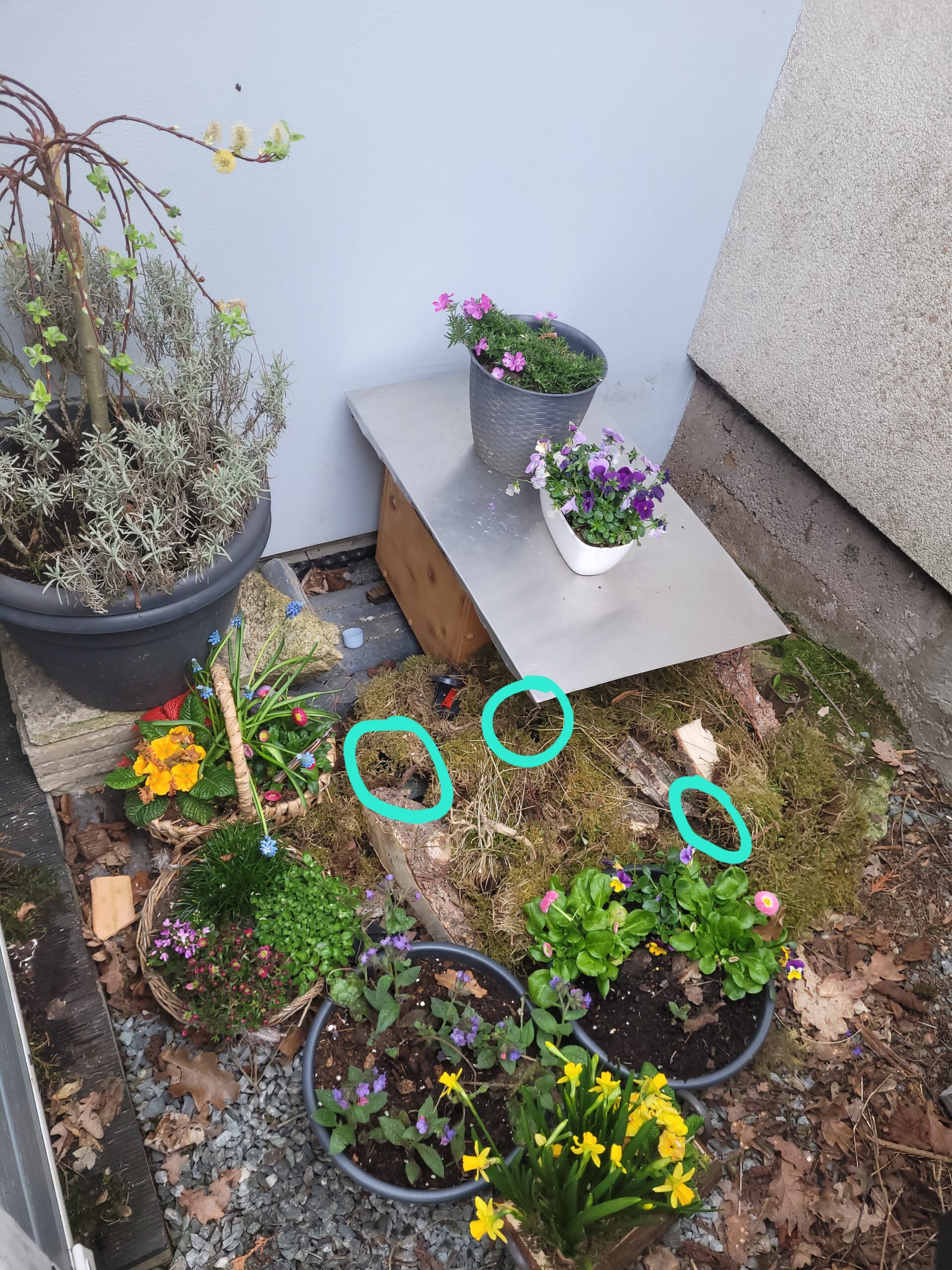 Die umkreisten Stellen solltest du am besten noch mal mit Moos abdecken, da sie in der aktuellen Form auf Hummelköniginnen interessant wirken könnten und vom Hummelhauseingang ablenken. Ziel der Dekoration ist ja, dass das Einflugloch des Kastens die einzige attraktive Öffnung in der Umgebung des Kastens ist und im Suchflug gut zu finden ist.