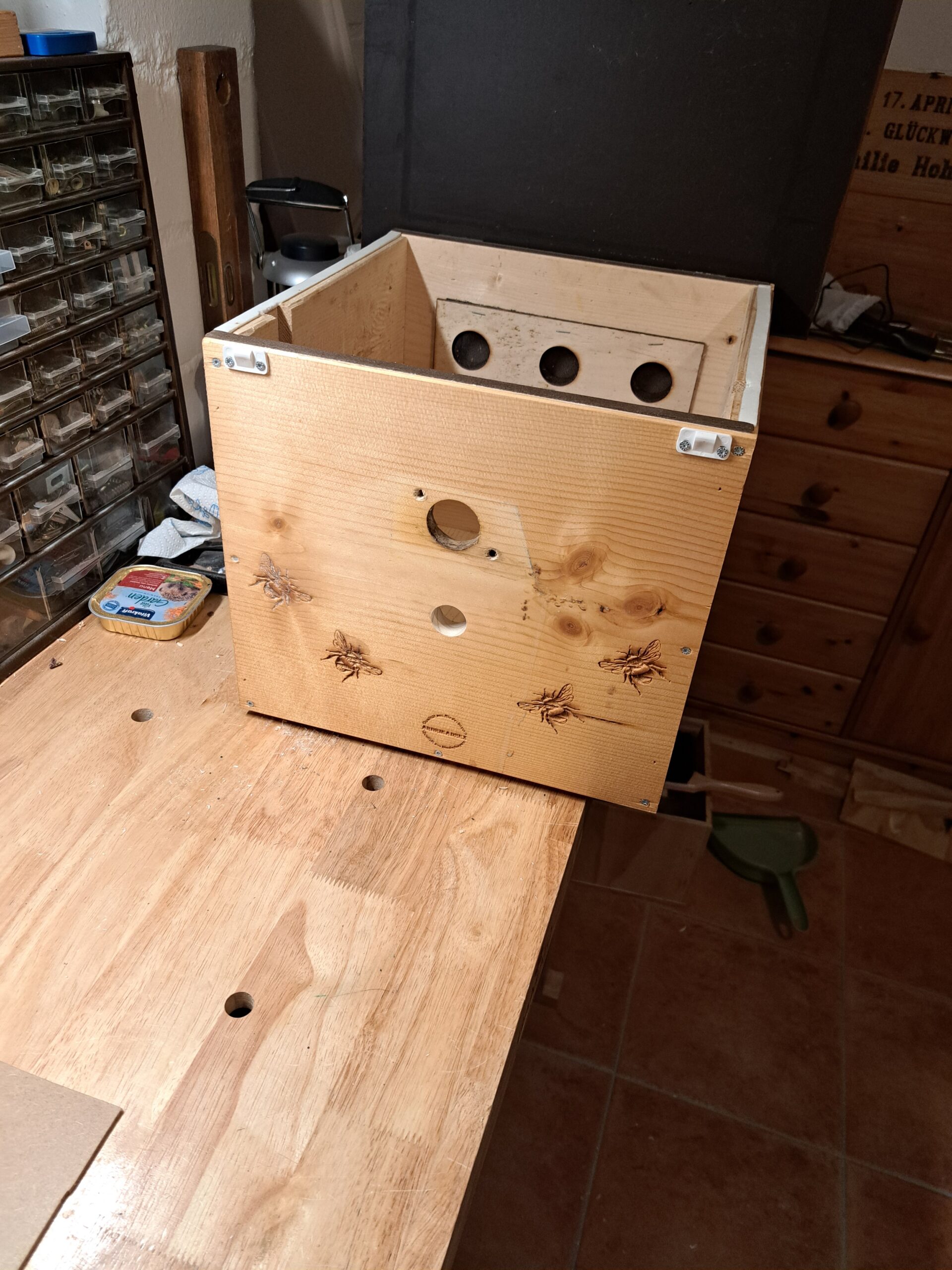 Fertig ist der modifizierte Hummelkasten. Der Innenkasten hat rundherum 1-2 cm Rundumluft und wird noch mit Metallgaze und Pappdeckel abgedeckt.