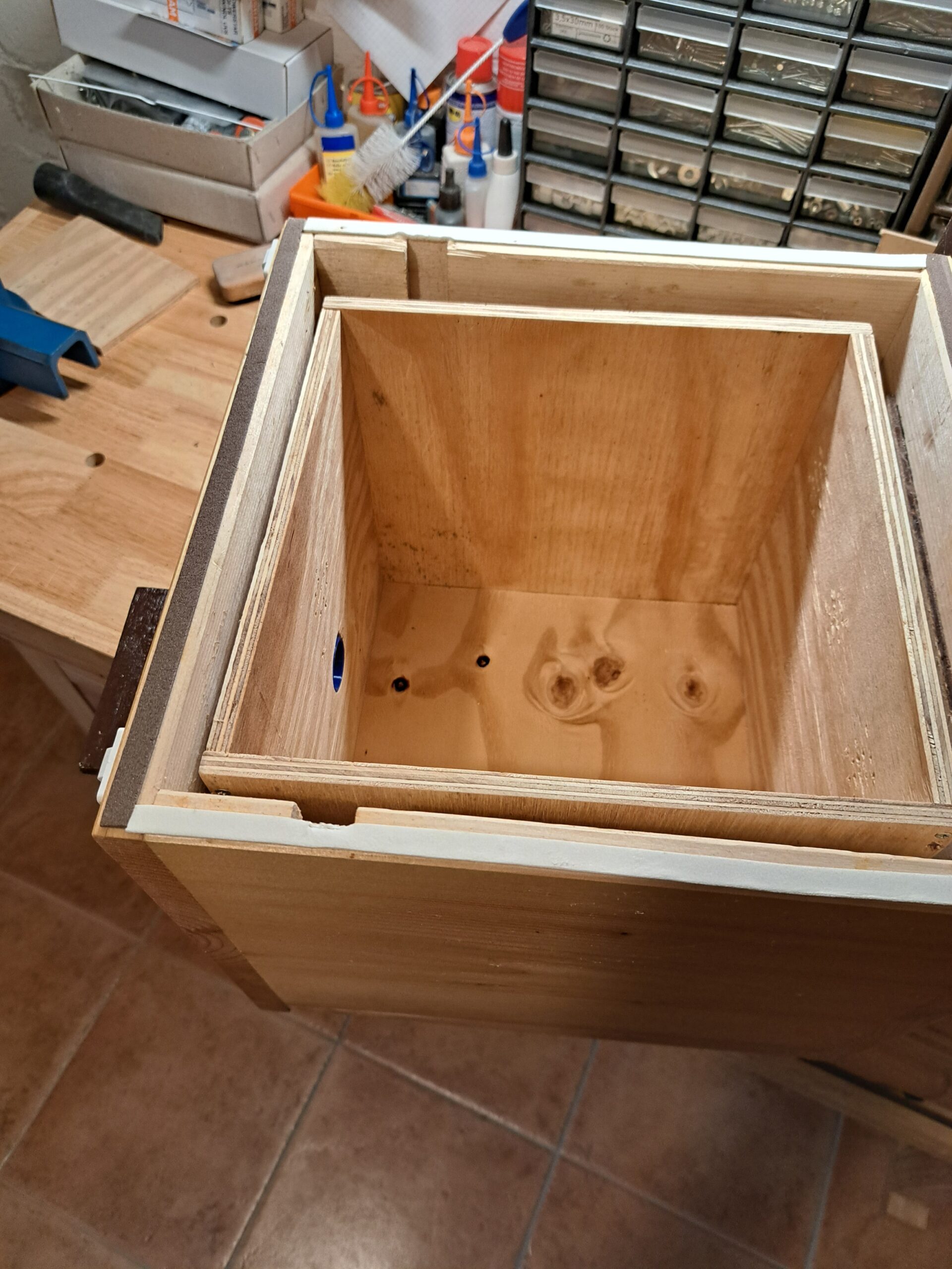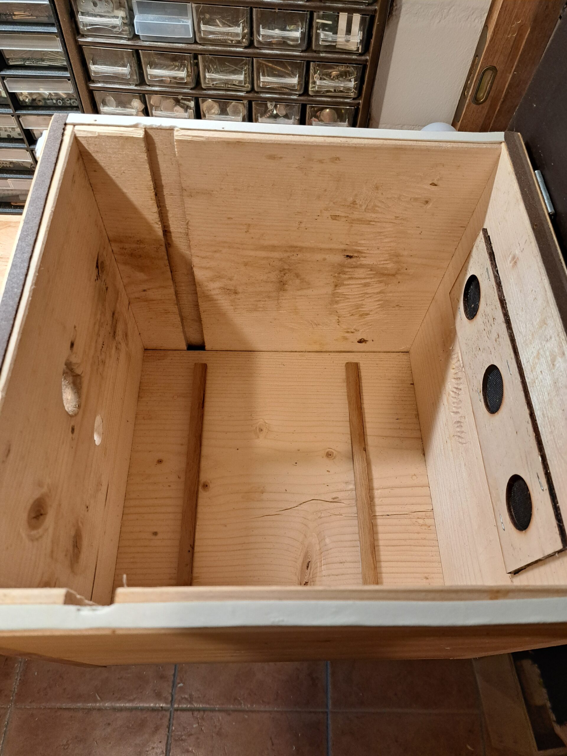 Ich habe den Vorbau entfernt (das Loch wird ein weiteres Lüftungsloch), darunter ein weiteres Loch für den neuen Eingang gebohrt, 2 Leisten für die Umluftzirkulation beim Innenkasten eingeklebt, einen neuen Vorbau angefertigt, Einlaufstutzen (25 mm) angeschraubt, Vorbau lakiert und montiert, Innenkasten aus Holz gefertigt und eingesetzt.