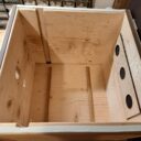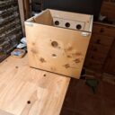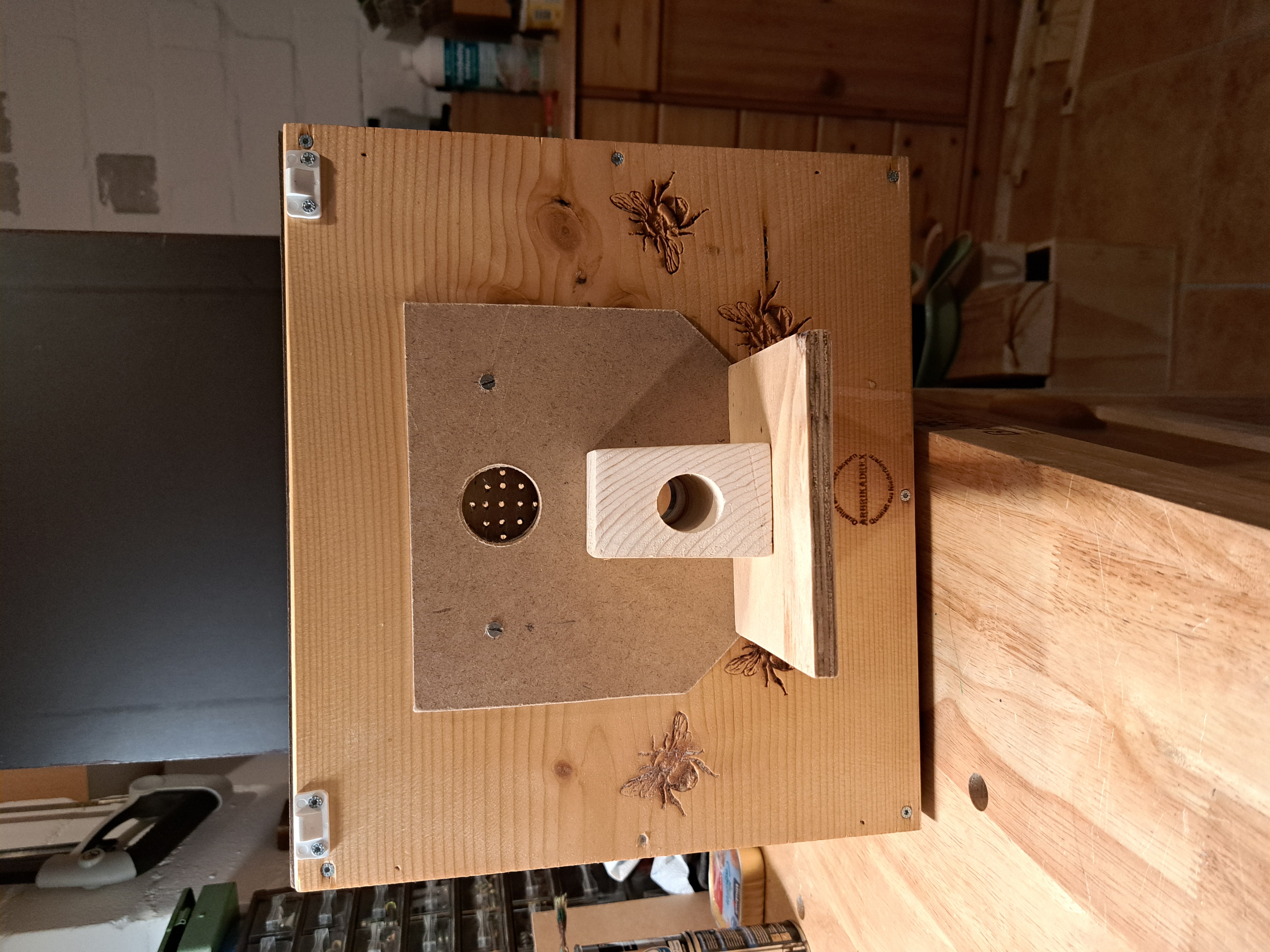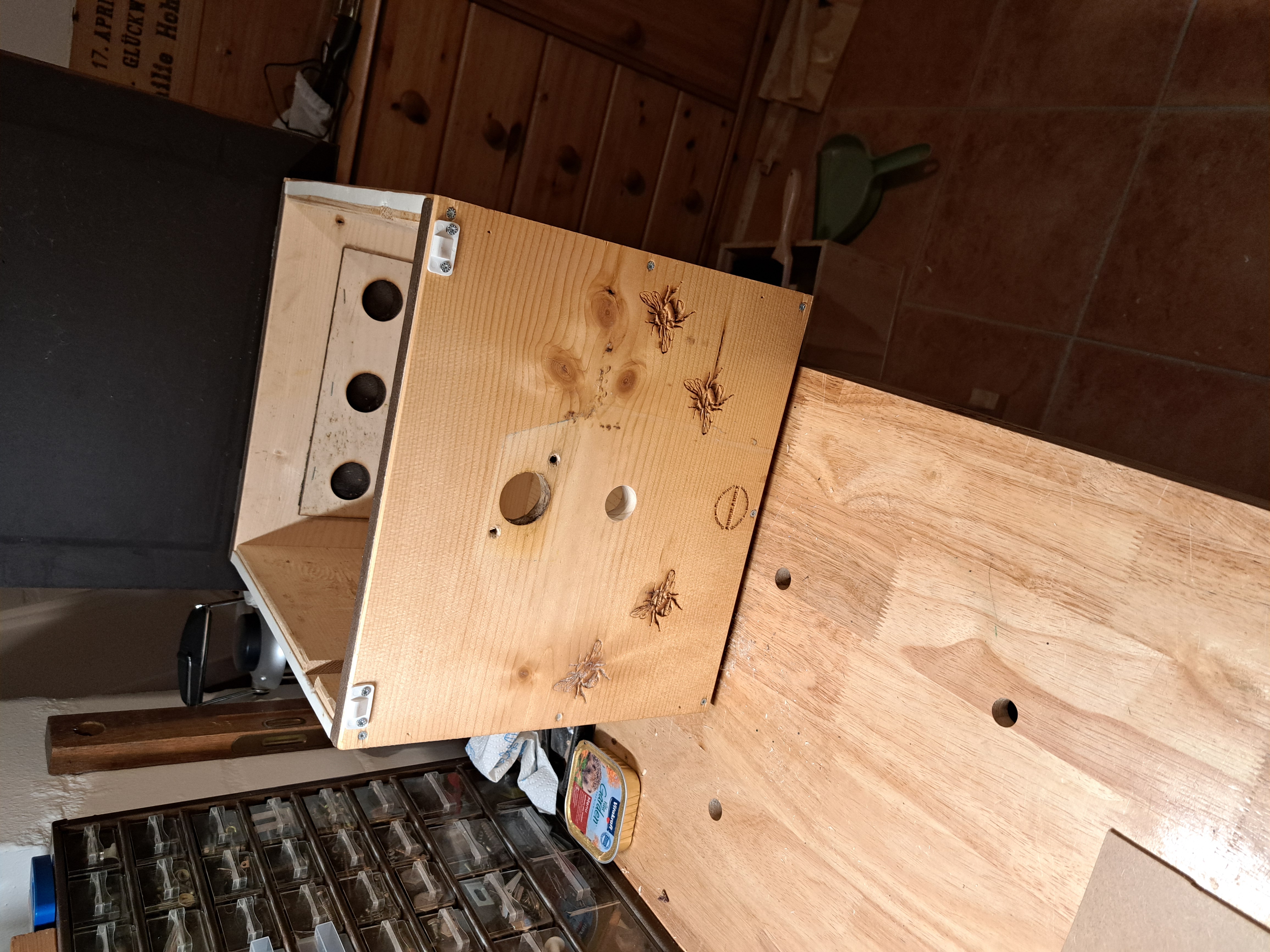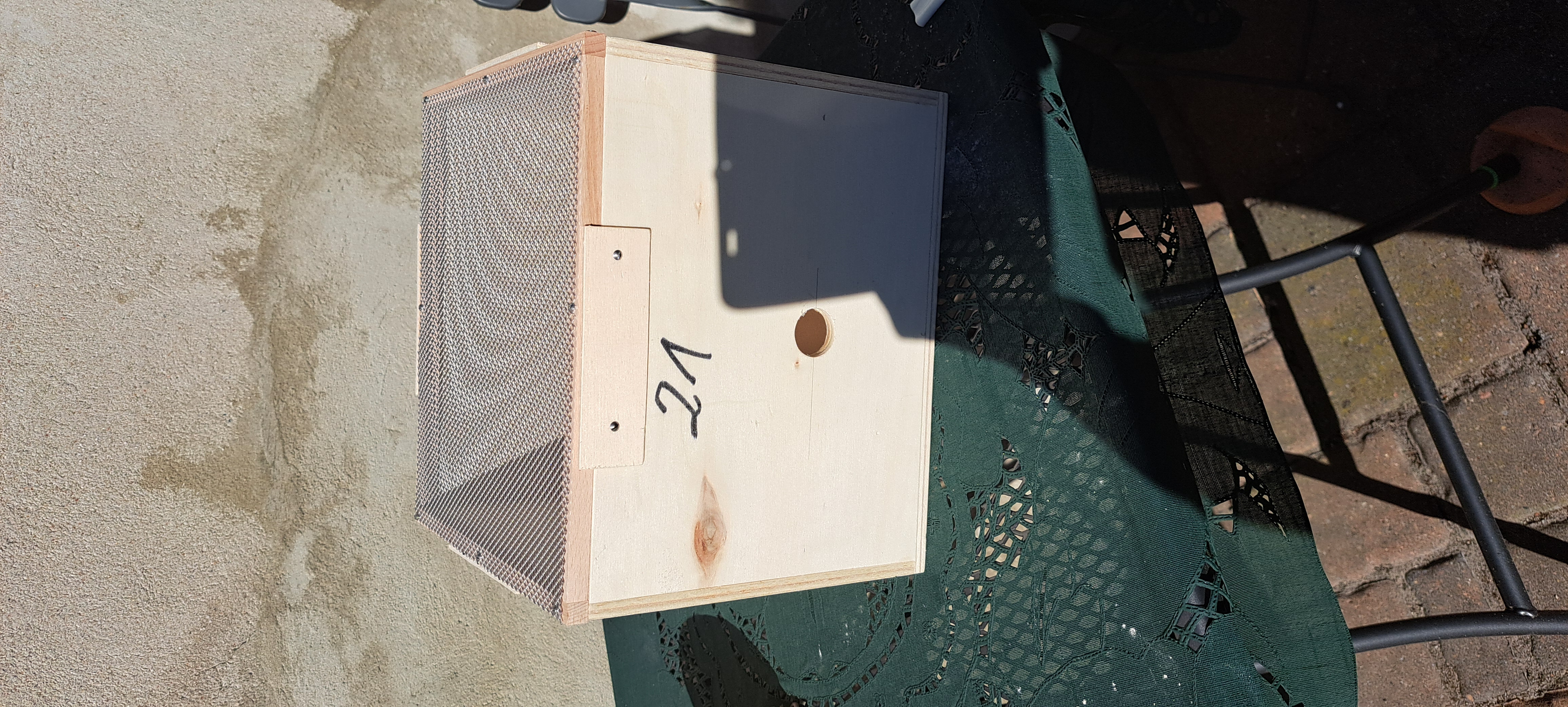 Die selbst gebauten Hummelhäuser fertige ich aus Siebdruckplatten. Im abgebildeten Kasten war dies Jahr ein Erdhummelvolk. Zu groß für den Kasten von 43 x 33 x 33 cm. Das Volk war erfolgreich, aber der Pappinnenkarton löste sich am Ende auf. Daher jetzt der Holzinnenkarton. Auf beiden Seiten sind viele kleine Lüftungslöcher gegenüber den großen Lüftungen im Außenkasten. Auf dem Innenkarton liegt feine Metallgaze, um bei Bedarf hineinsehen zu können. Als Abdeckung liegt noch eine Platte aus Hartpappe drauf, die im Laufe der Saison abgenommen wird.