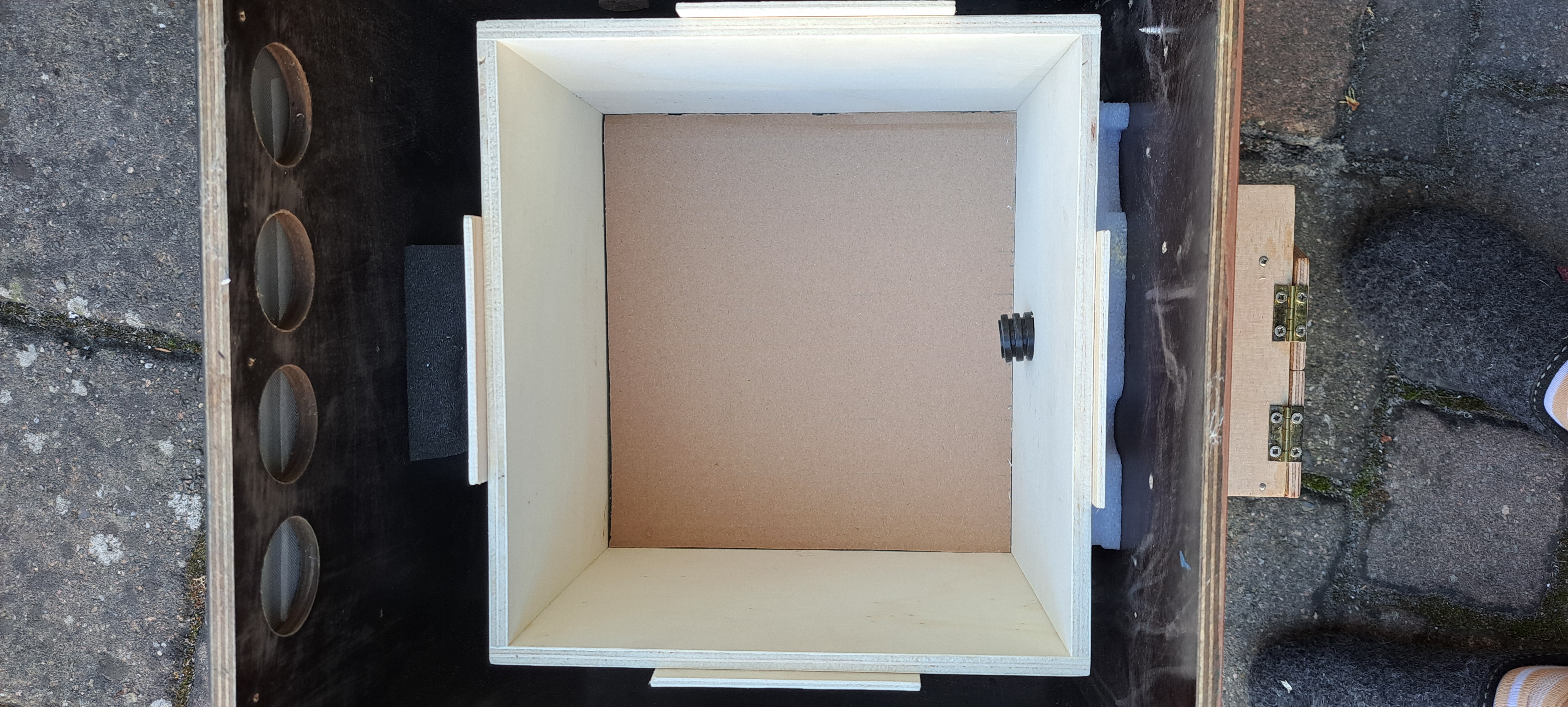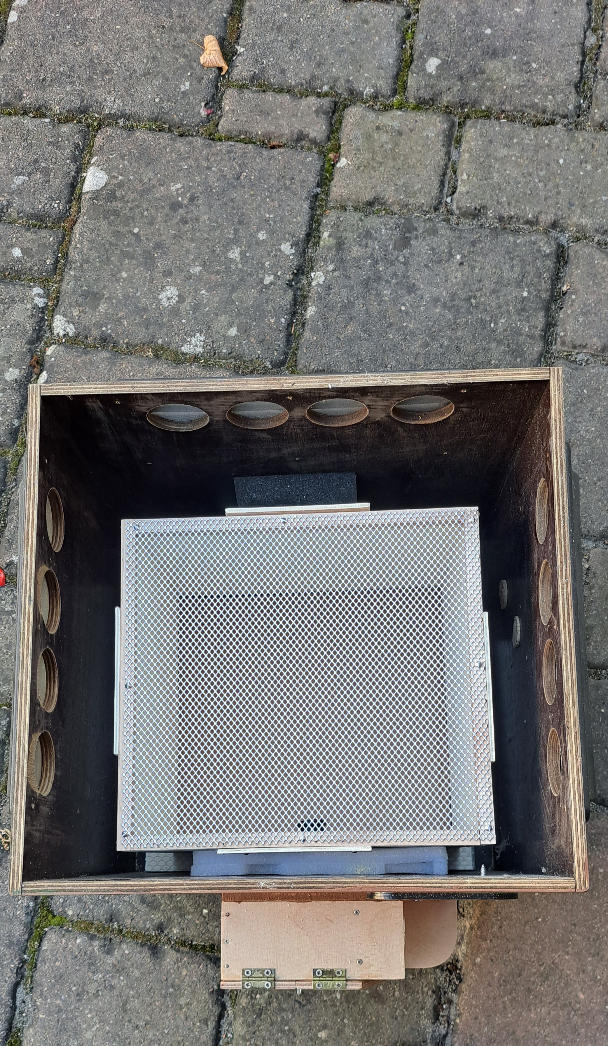 Das ist wirklich eine perfekte Belüftung für einen Holz-Hummelkasten. Und dazu die Höhe des Holz-Innenkastens nur bis zur Unterkante der äußeren Lüftungslöcher, sodass die Luft permanent über das Lüftungsgitter streifen und zirkulieren kann. Hervorragend!