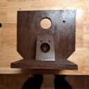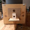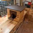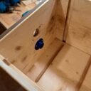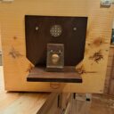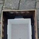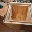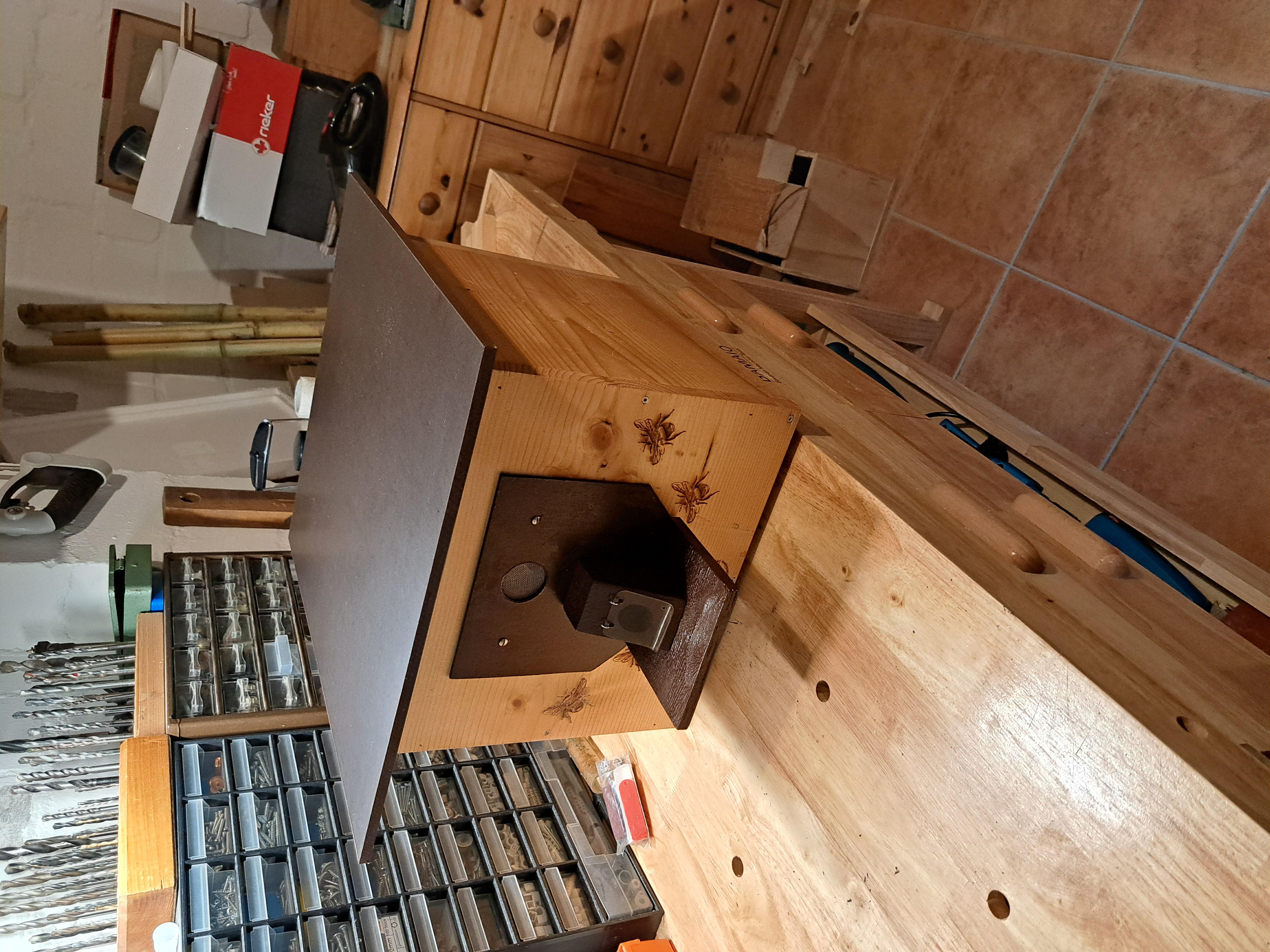 Ich habe den Vorbau entfernt (das Loch wird ein weiteres Lüftungsloch), darunter ein weiteres Loch für den neuen Eingang gebohrt, 2 Leisten für die Umluftzirkulation beim Innenkasten eingeklebt, einen neuen Vorbau angefertigt, Einlaufstutzen (25 mm) angeschraubt, Vorbau lakiert und montiert, Innenkasten aus Holz gefertigt und eingesetzt.