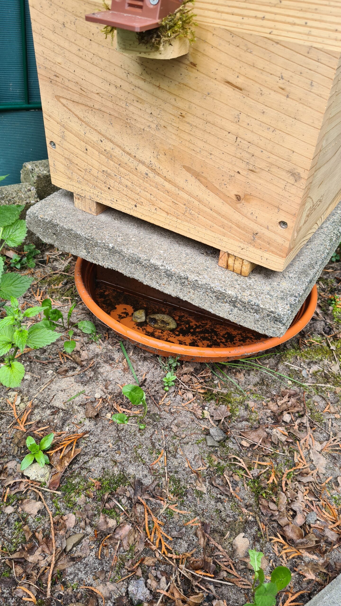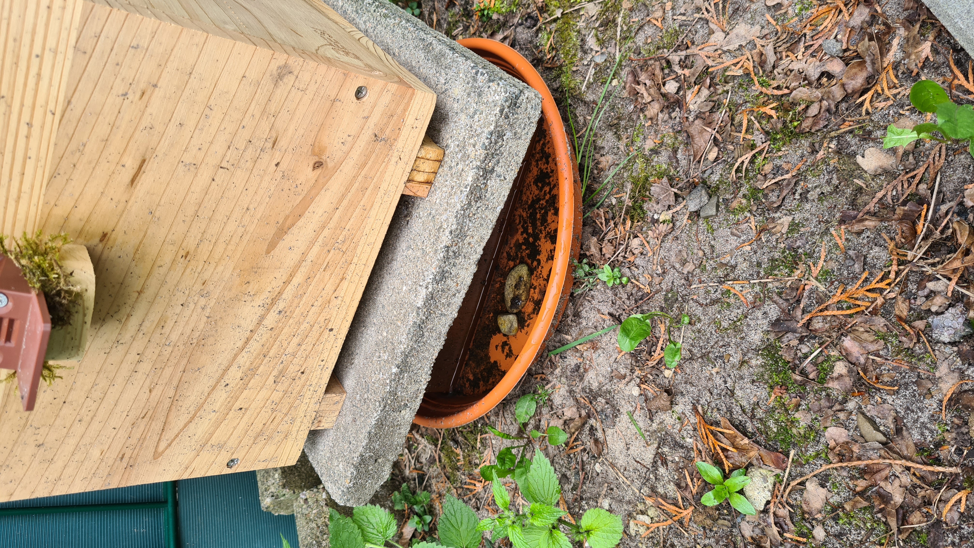 Ich habe jetzt flache Steine in die Sperre gelegt, so das sich Tiere darauf retten und vor allem Hummeln nicht mehr untergehen können. Ameisen kommen trotzdem nicht rüber. Außerdem habe ich die Platte etwas nach vorne geschoben, so das die Steinplatte über die Wassersperre ragt. Das ist noch nicht optimal, ich werde mir demnächst eine größere Steinplatte kaufen, aber erstmal geht es.