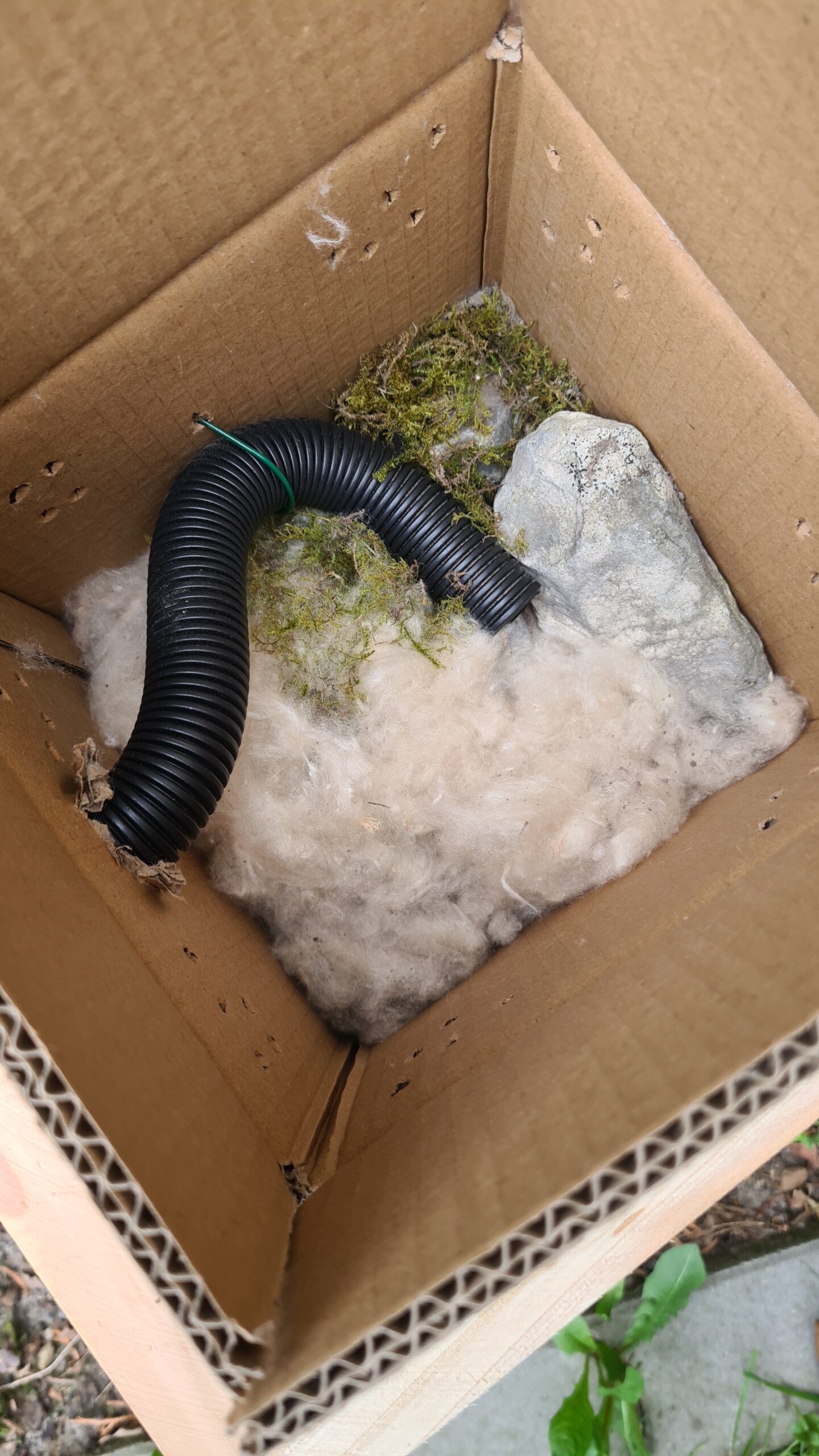 Mein Hummelkasten ist übrigens der vom Hersteller “Erdenfreund” mit Wachsmottenklappe.