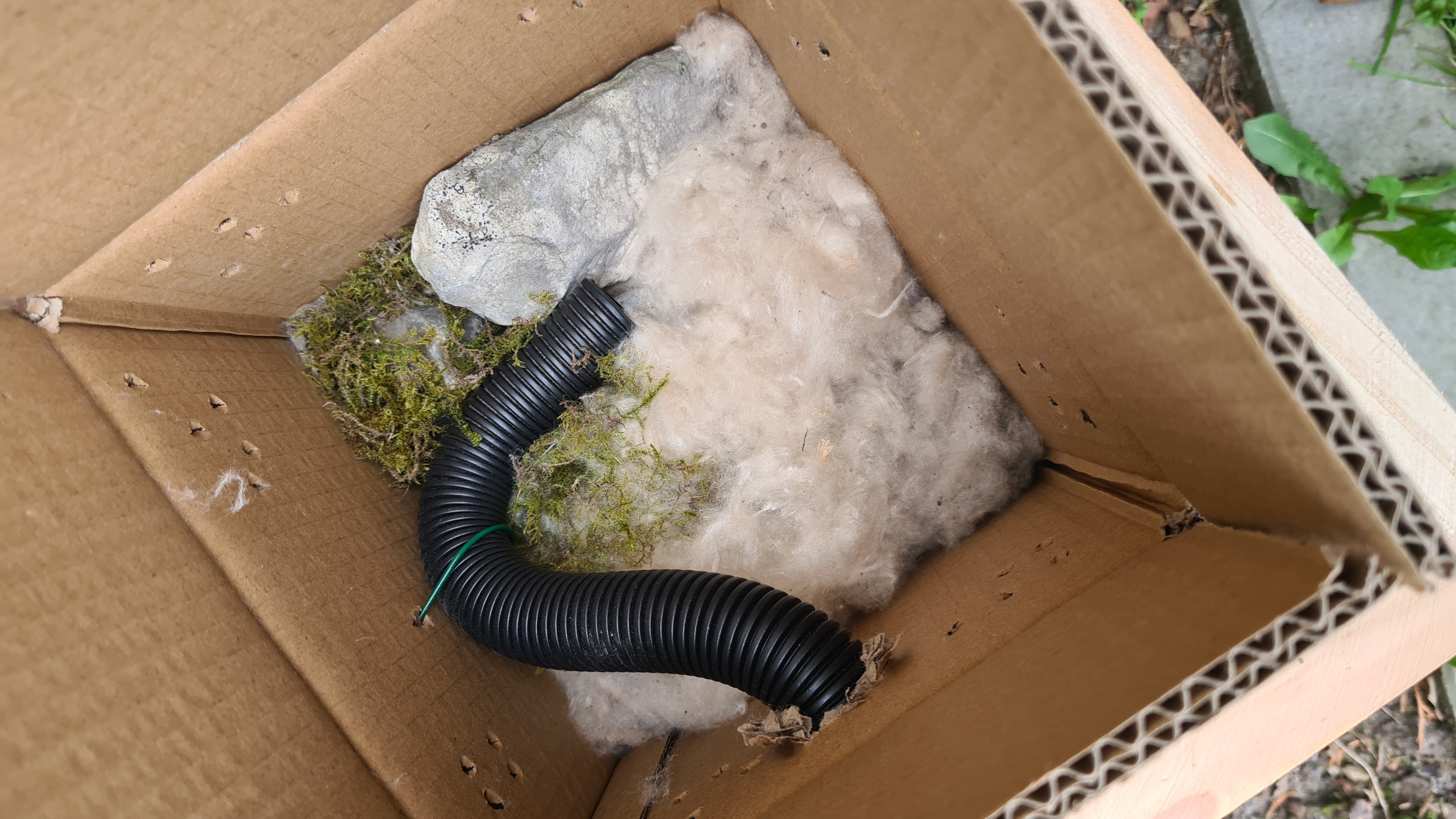 Mein Hummelkasten ist übrigens der vom Hersteller „Erdenfreund“ mit Wachsmottenklappe.