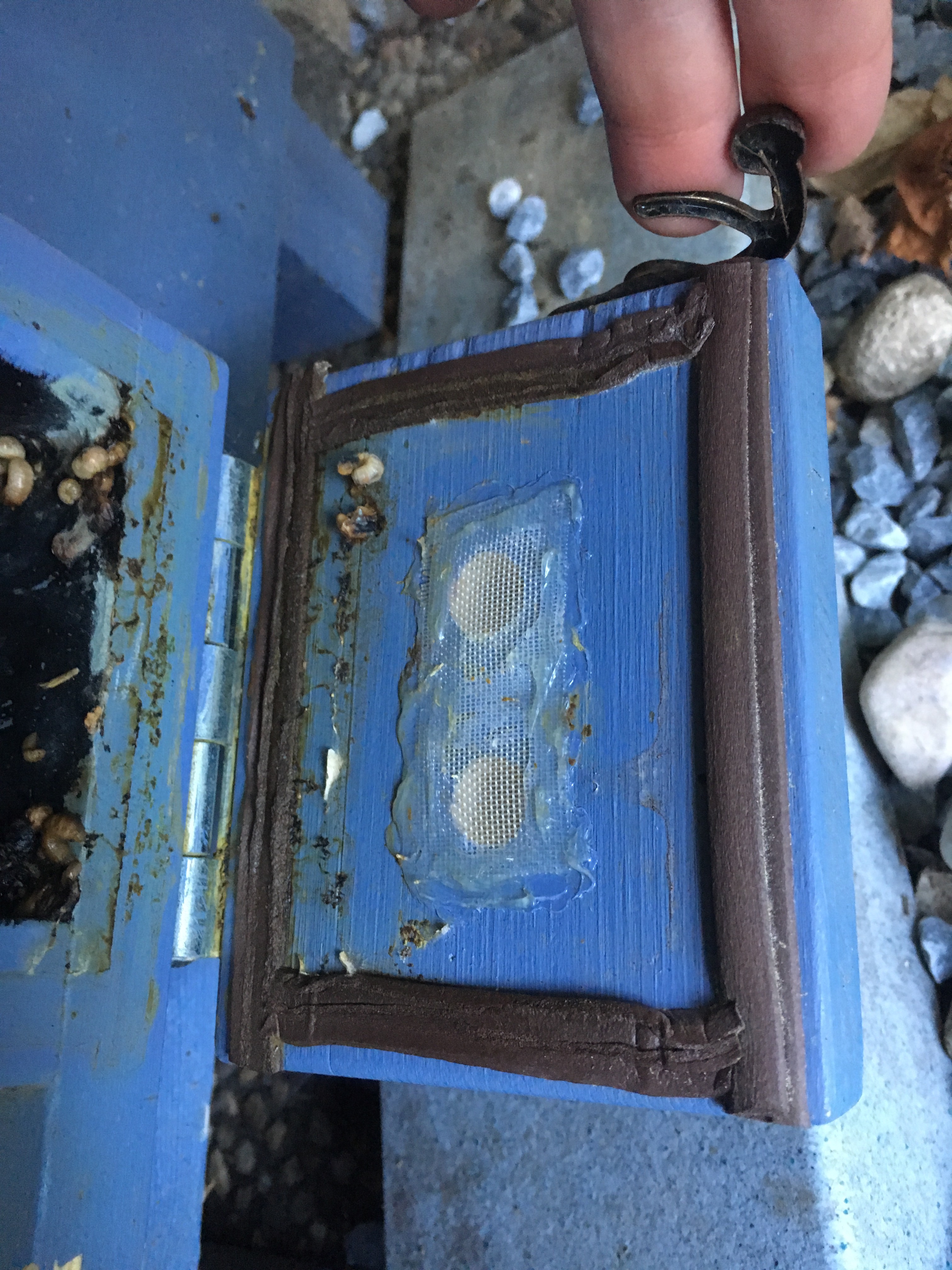 einfalls und mit feinem Fliegengitter verschlossen. Im Zwischenraum haben wir auf Papier Raupenleim ver-