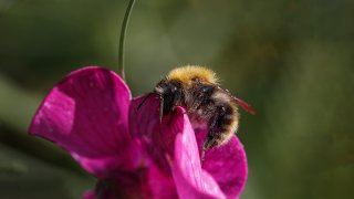 Nach dem Regen von gestern sucht heute eine Ackerhummel bereits vormittags darin Nahrung.