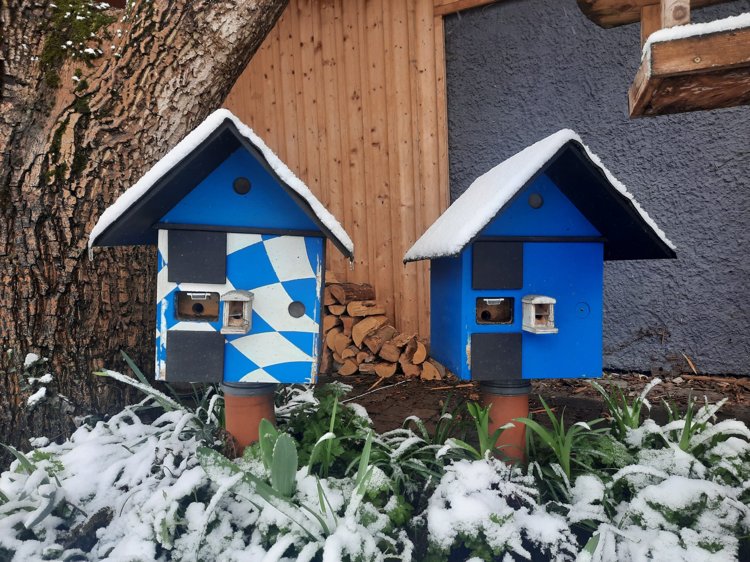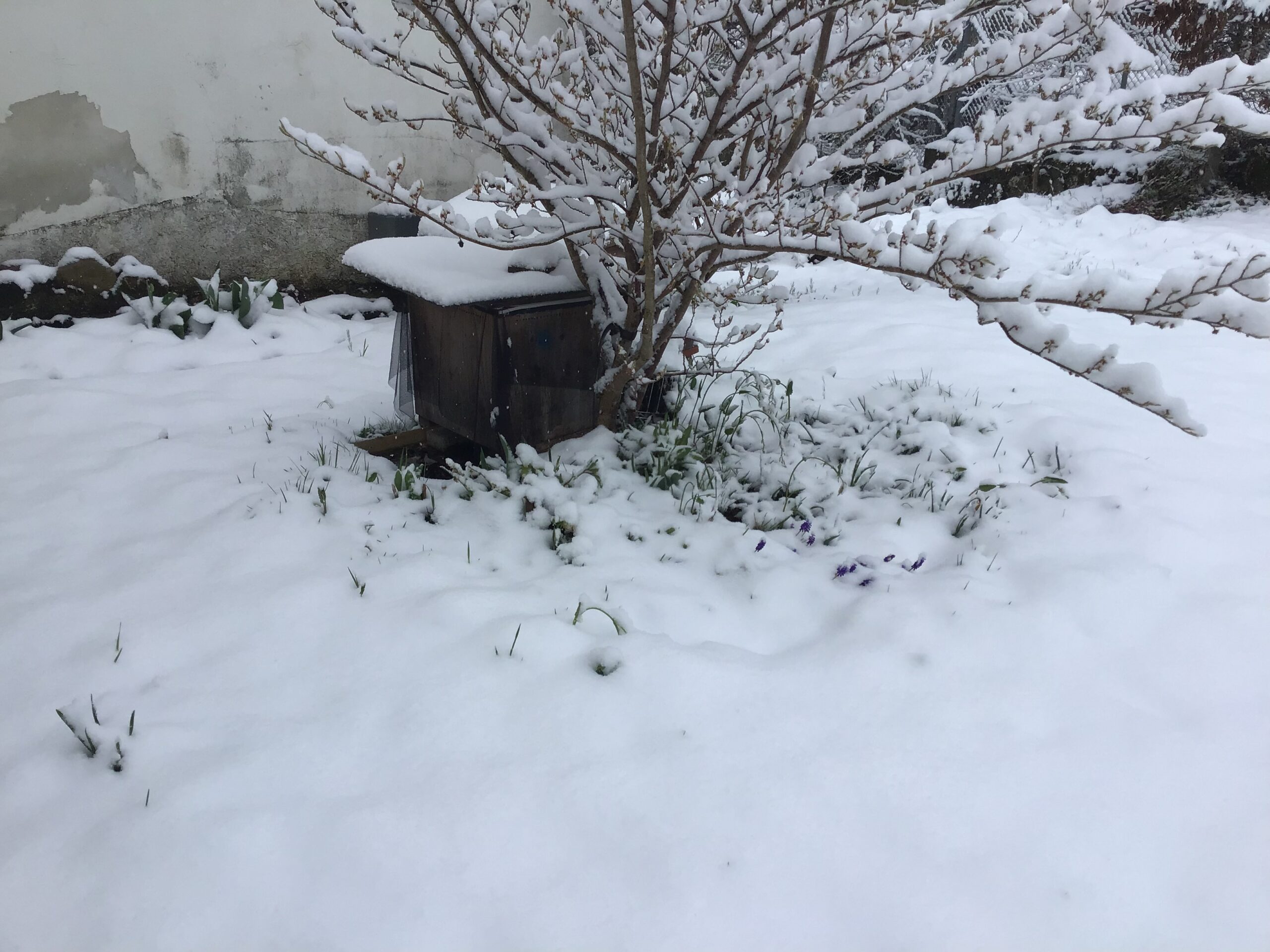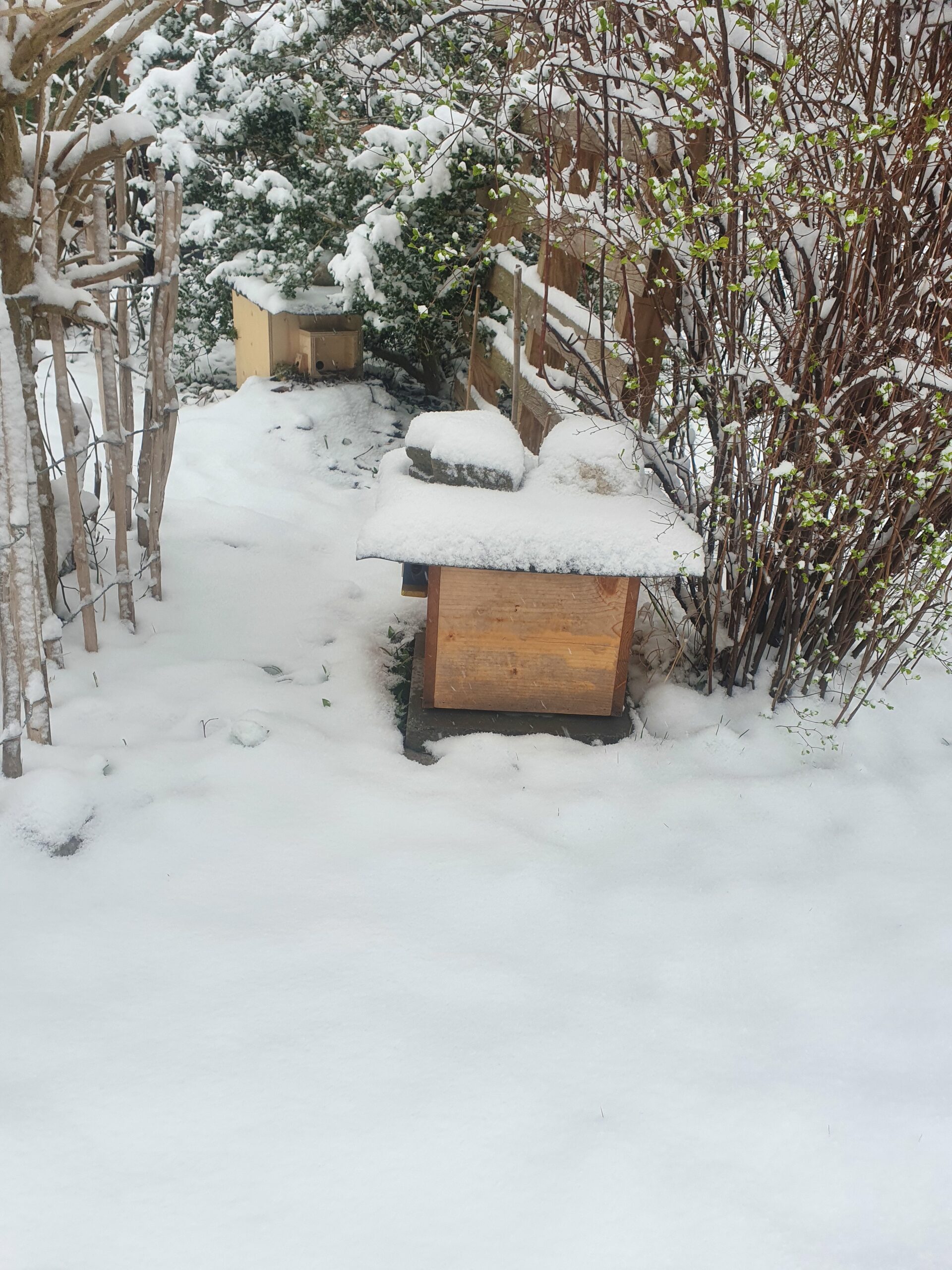 Heute liegen 3cm Schnee, ich hoffe dass die Königinnen an die Zuckerlösung gehen.