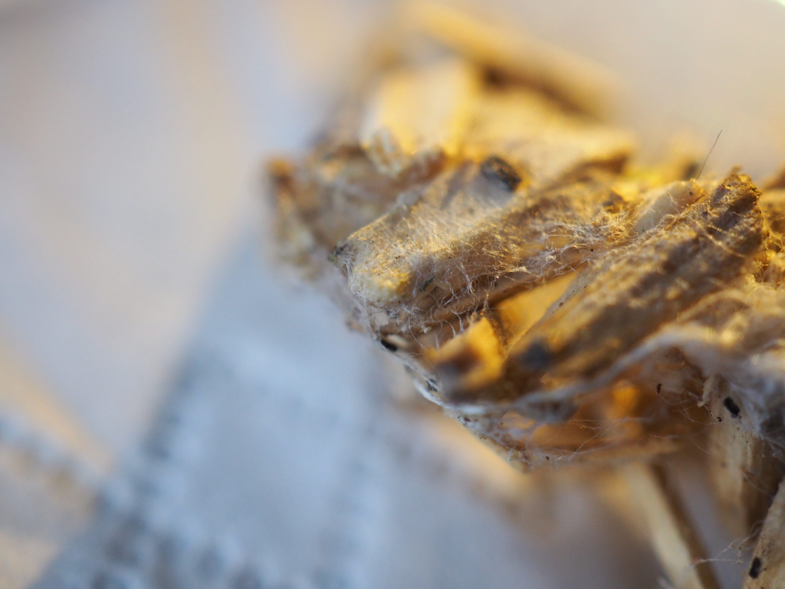 Das ist aber interessant. Spinnen die Holz- oder Pflanzenstäbchen für den Nestbau verwenden kenne ich nicht. Kannst du mal genau untersuchen was das für ein Material ist. Mit einem Macro kann man es vielleicht erkennen. Auf alle Fälle würde ich es in ein großes Glas verfrachten und sehen wollen, was daraus schlüpft. Leben wird da ja noch drin sein, wenn sich die schwarzen Punkte nicht als Kot erkennen lassen.