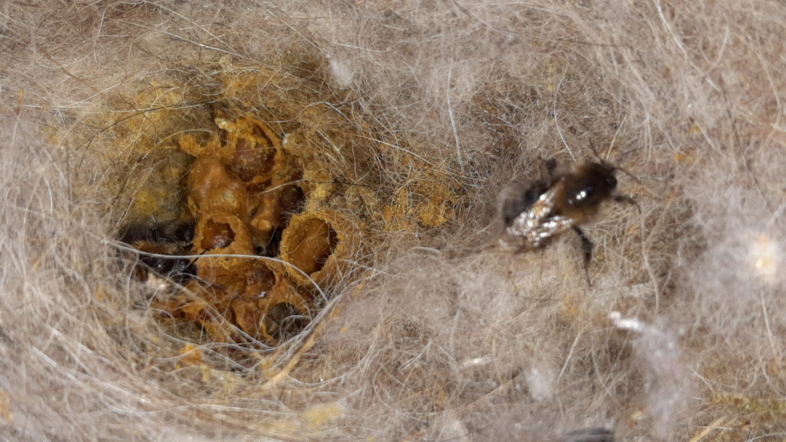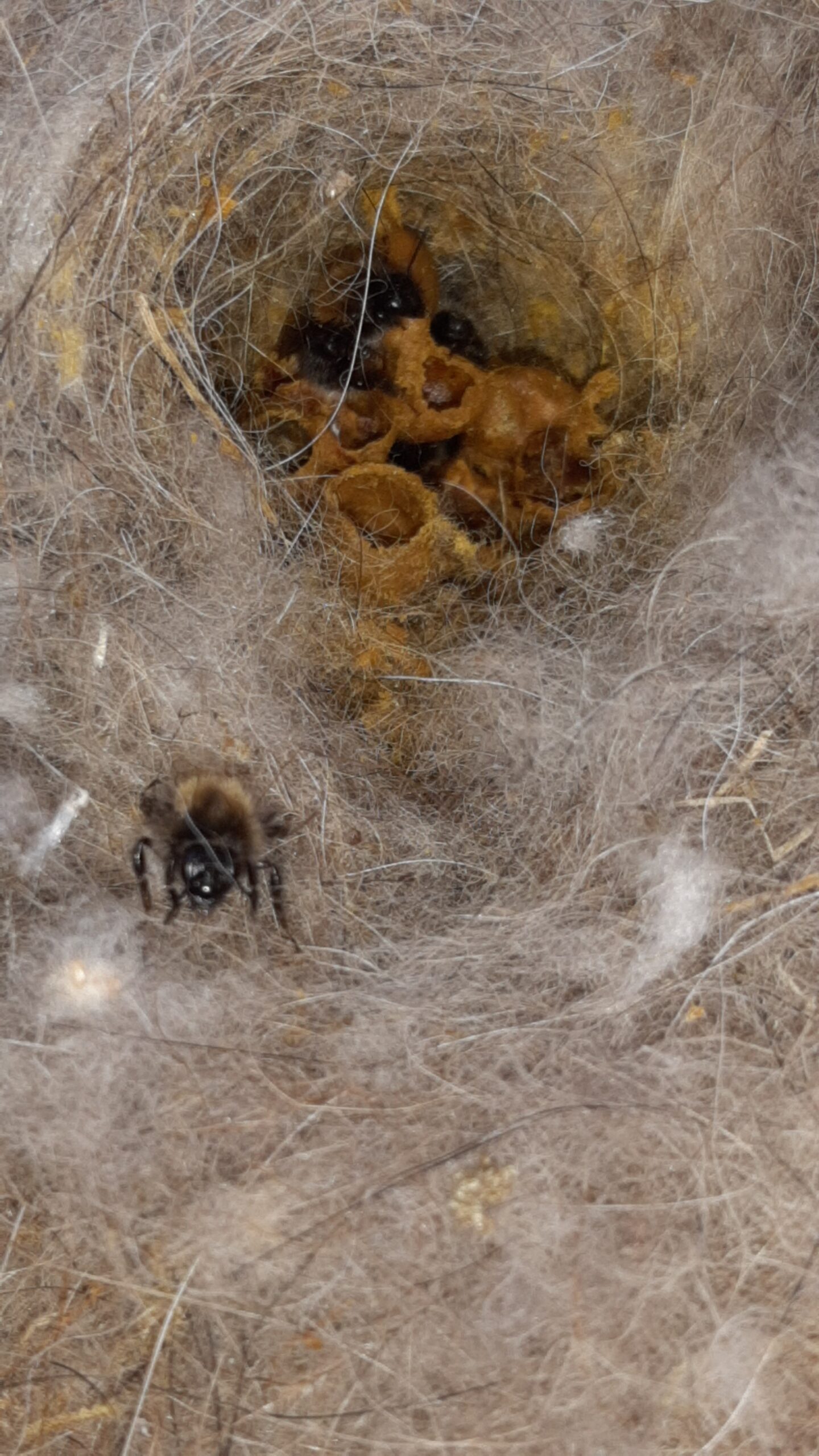 @Grizztine Ich vermute, das Nest wird noch sehr klein sein. Folglich werden noch nicht so viele Arbeiterinnen da sein. Hummeln umgeben ihr Nest in aller Regel mit einer dünnen Wachsschicht, das ist dann die eigentliche Nestkugel, in der sich auch die Waben und Nektartöpfchen befinden. Ich vermute die Nestkugel unter den Holzstückchen und dem Reisig.