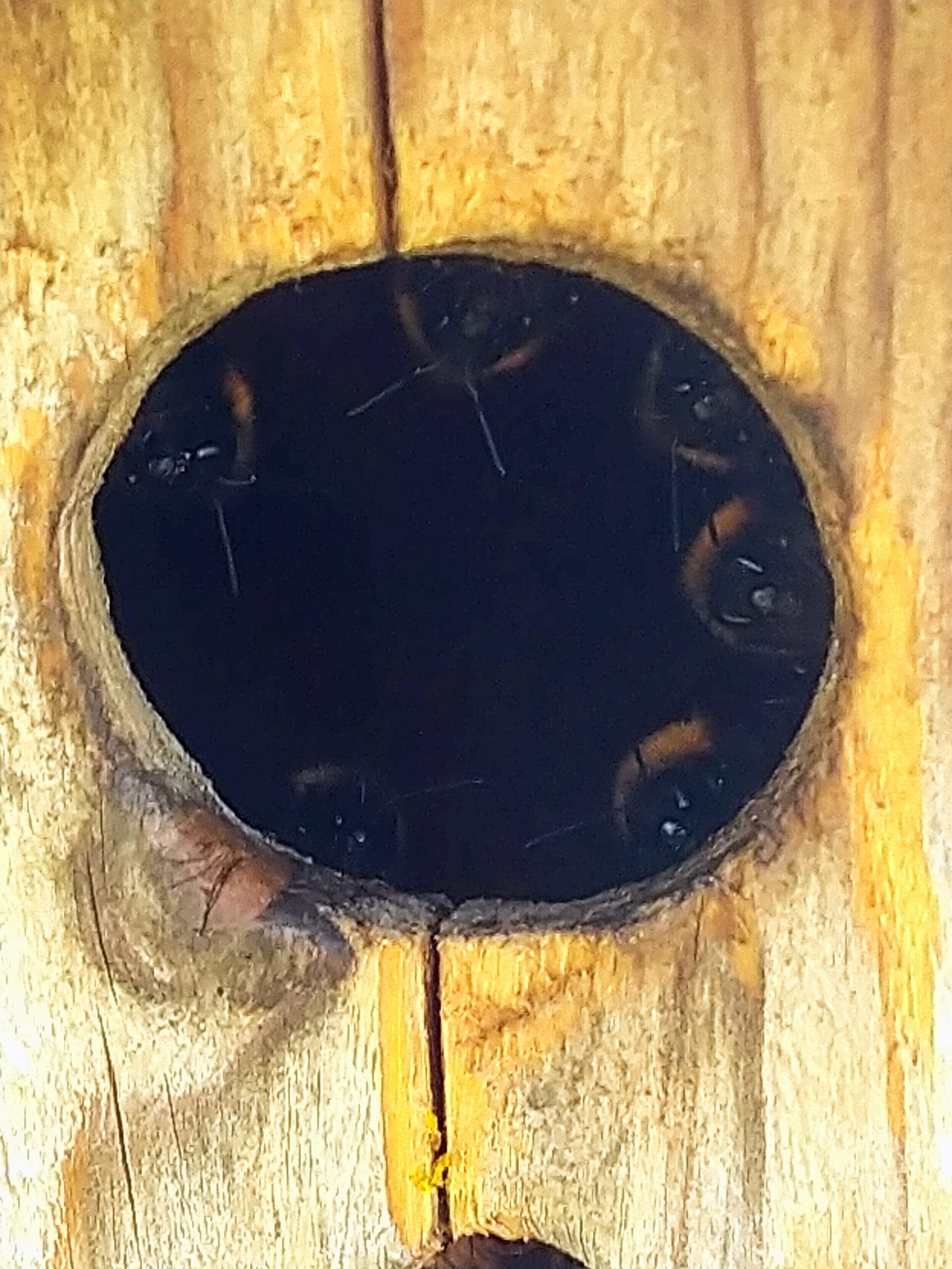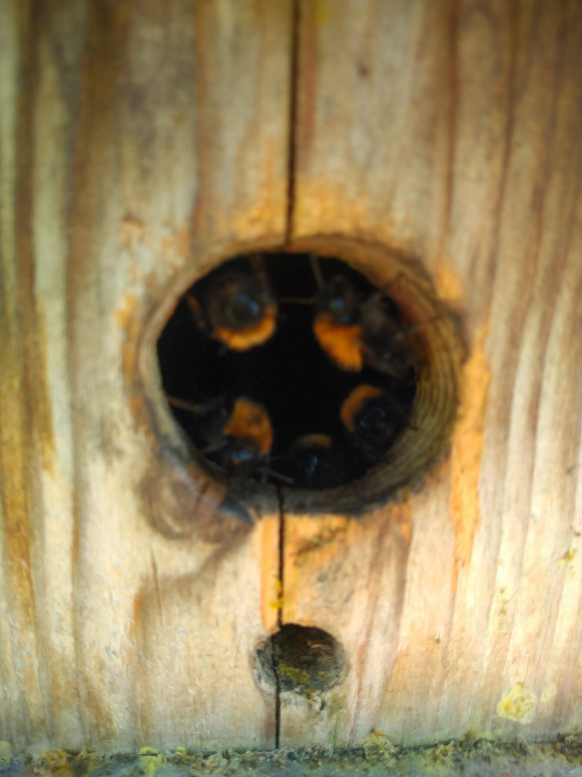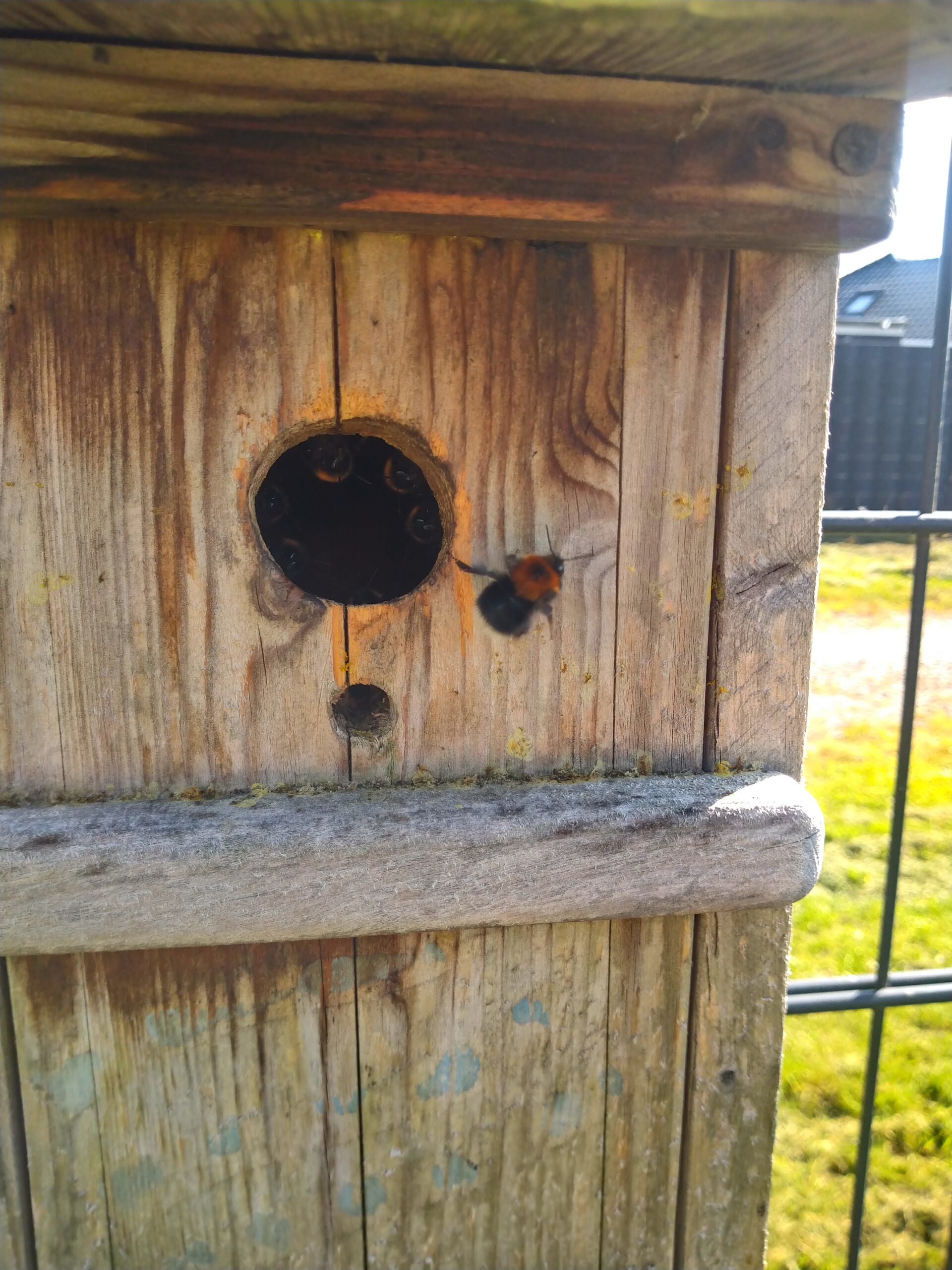 Ich habe mich heute tatsächlich erschreckt 🙈 Ich bin an meinem von Hummeln bewohnten Meisenkasten vorbeigegangen und dachte, was da denn wohl so glänzt. Ich bin dichter ran, da sehe ich die Hummeln im Kreis um das Einflugloch sitzen! Ich habe ein Foto angehängt. Und ich habe eine Hummel beim wegfliegen fotografieren können. Jetzt, da so viele Hummeln im Eingang sitzen, kommen sie nur langsam weg. Da schaffe ich es, zu fotografieren. Sind das am Eingang eigentlich Wächter? Sieht irgendwie aus, als würde der Meisenkasten überlaufen 😃