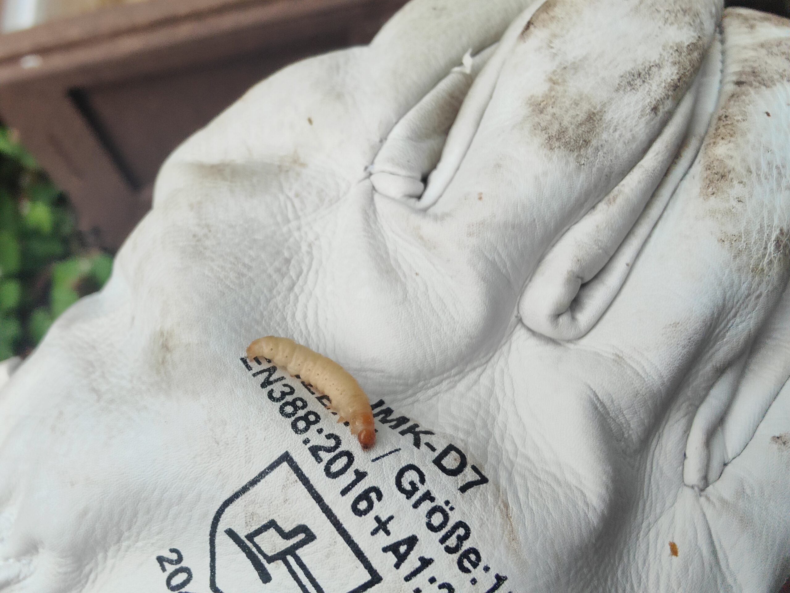 Na ja, sei’s drum. Ich gönne dem Volk jetzt einen ruhigen Lebensabend. Die anderen acht Völker entwickeln sich gut bzw. sind durch (1x Baum- und 1x Wiesenhummel), obwohl ich an den Kästen beinahe täglich Wachsmotten entferne. Ich kontrolliere, sofern Zeit, dazu auch regelmäßig die Wachsmottenklappe, dass diese auch korrekt schließt. Anbei ein paar Fotos der Wachsmotten-Bekämpfungsaktion.