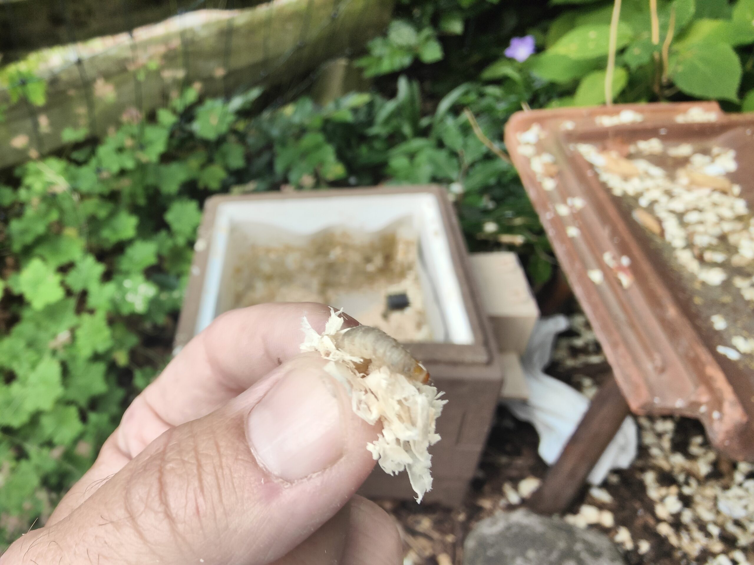 Ich habe bei dem Nest auf Nestkonstrollen weitgehend verzichtet, weil es tief im Kleintierstreu (!) angelegt wurde. Nestkontrollen hätten dazu geführt, dass das Streu in die Nektartöpfchen fällt. Aufmerksam wurde ich auf den Befall, da ich heute Gespinste der Wachsmotten im Einlaufschlauch entdeckte, als ich den Vorbau sauber machen und die Legosteine auffüllen wollte.