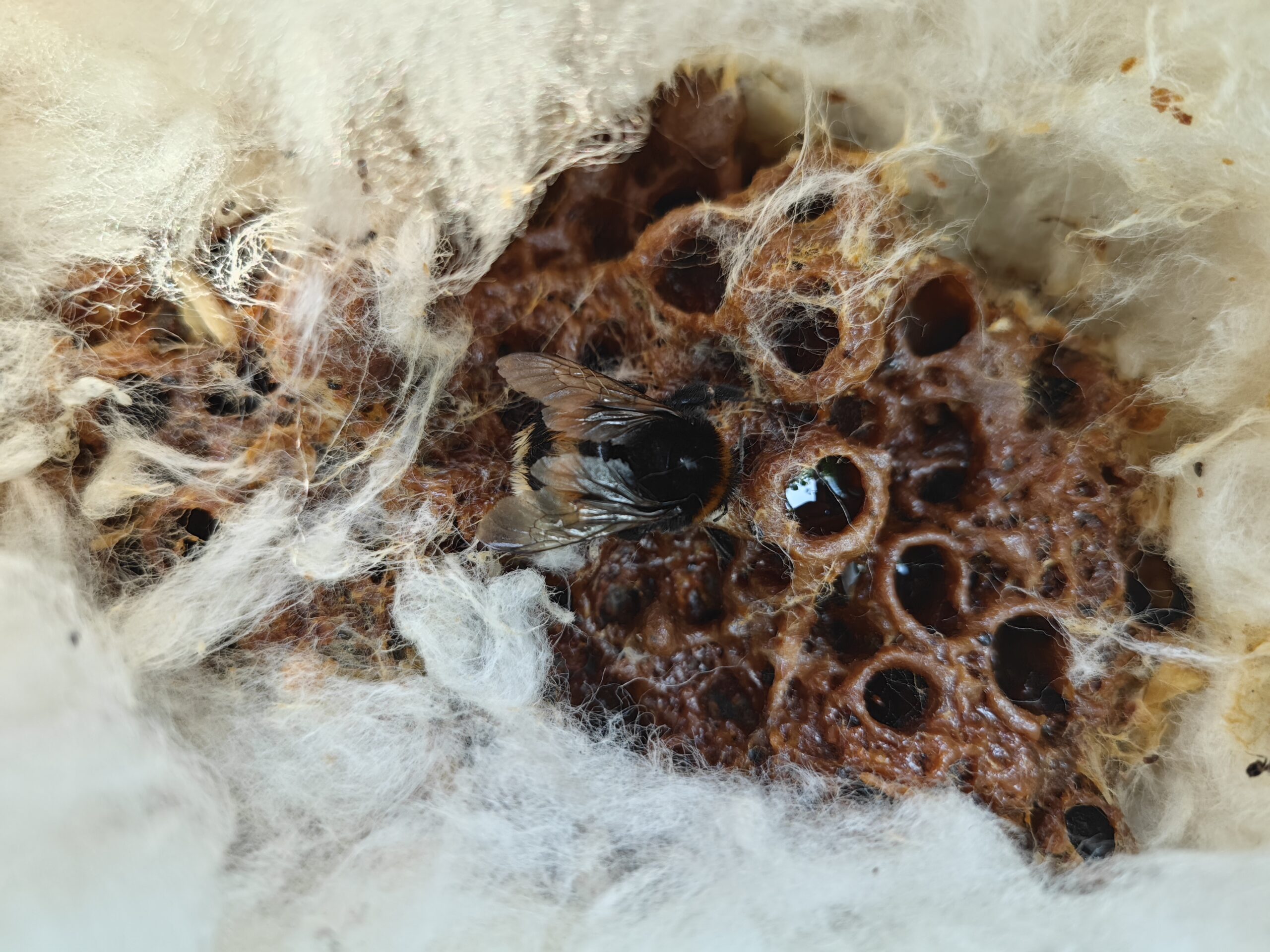Habe in diesem Jahr 4 dkl. Erdhummelvölker im Garten. 3 sind durch, kein Flugverkehr mehr und bei der Nestkontrolle auch keine lebenden Tiere mehr entdeckt. Zum Glück blieben die Völker von Parasiten verschont (Bt-Trockenbehandlung). Das 4. Volk (unterirdisch, Eigenbau) ist noch emsig. Das Nest liegt unter einer Schicht Kapok gut versteckt. Hier fliegen auch Jungköniginnen, aber sehr wenige. Das Völkchen ist auch relativ klein für Erdhummeln. Egal. Wichtig ist die Grundsteinlegung für 2024.