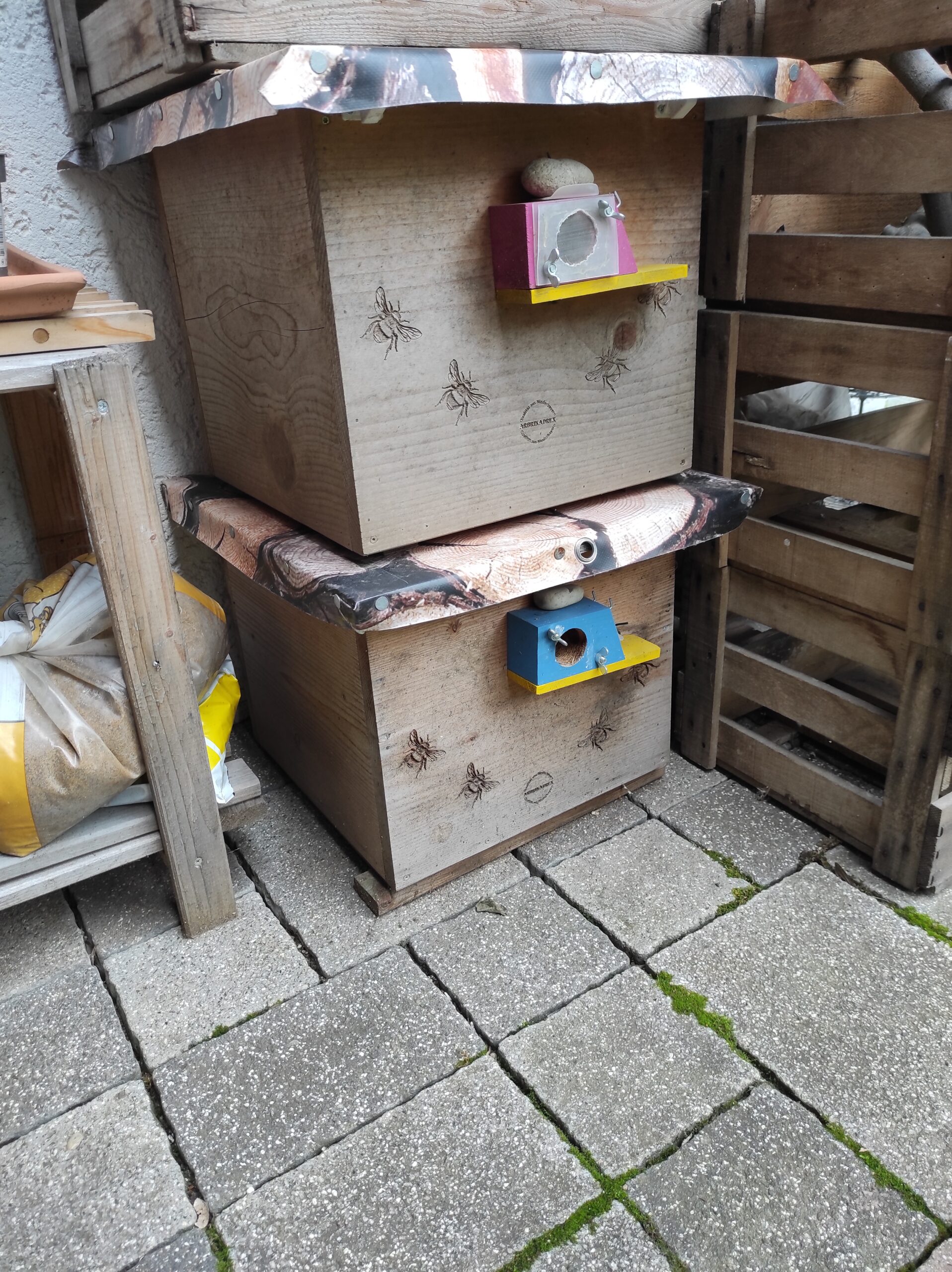 Jetzt habe ich die Kästen schon länger zur Überwinterung neben dem Haus an einer trockenen Stelle übereinander aufgestellt (siehe Bild).