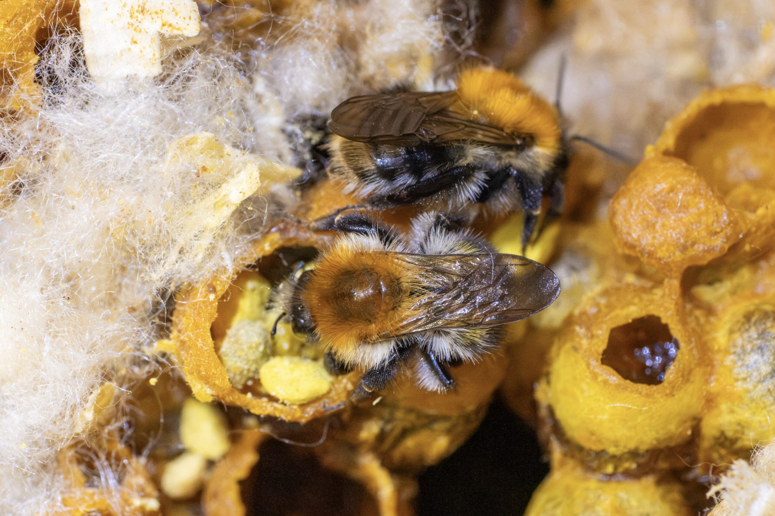 Die Arbeiterinnen machen sich sofort über die Pollentöpfchen her, um ihre Larven zu füttern (siehe Fotos). Es befinden sich aktuell noch mindestens 16 Arbeiterinnen im Nest und 5 Eigelege und Larvenknäuele.