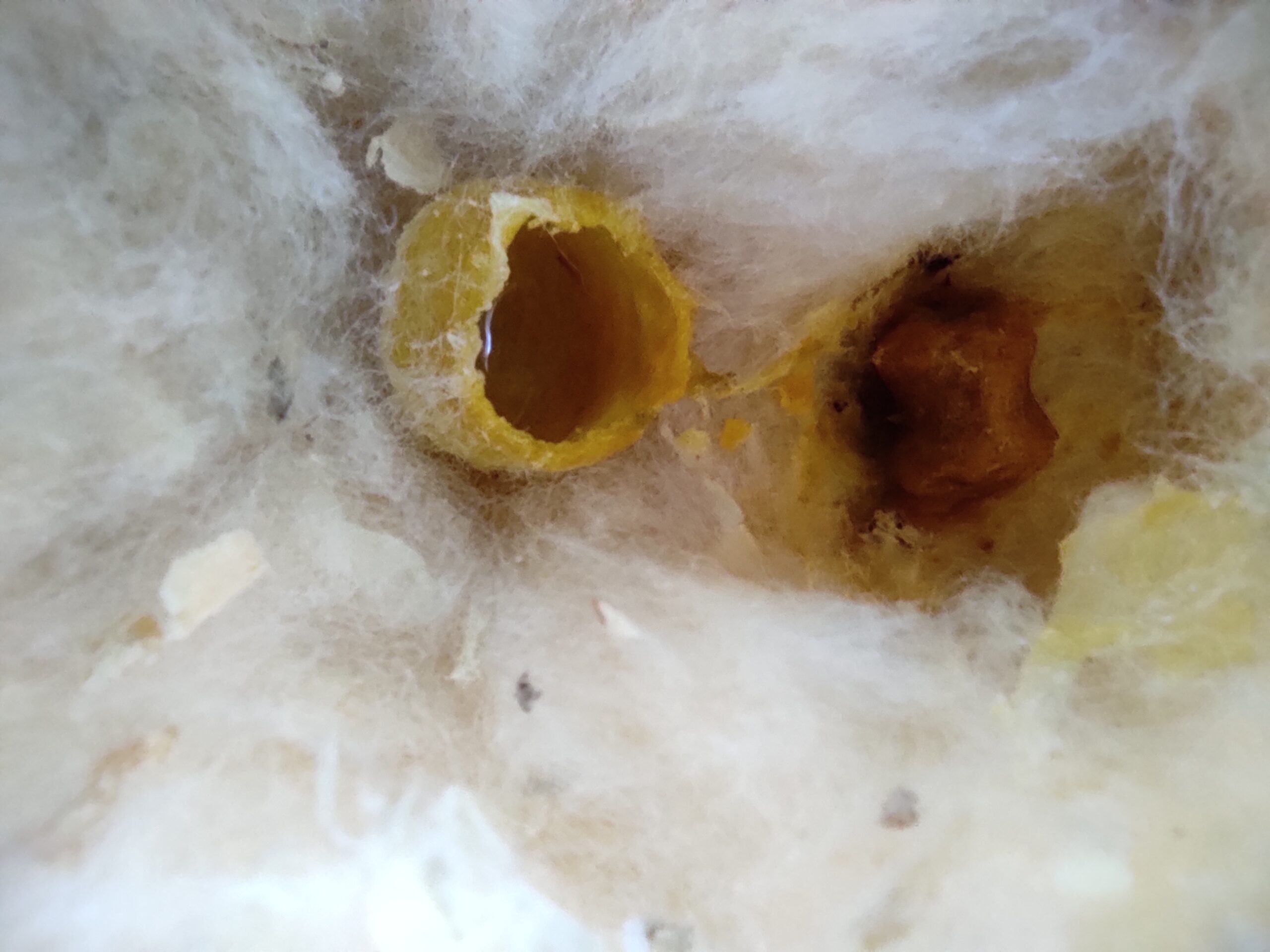 Im Haus war dann ein angefangenes Wespennest und der Nektartopf mit etwas undefinierbarem daneben (Larvenknäul?) verwaist. Von der Erdhummelkönigin nichts zu sehen….oder ist sie einfach so verschollen? Schade, mit dem blauen Haus soll es einfach nicht sein…