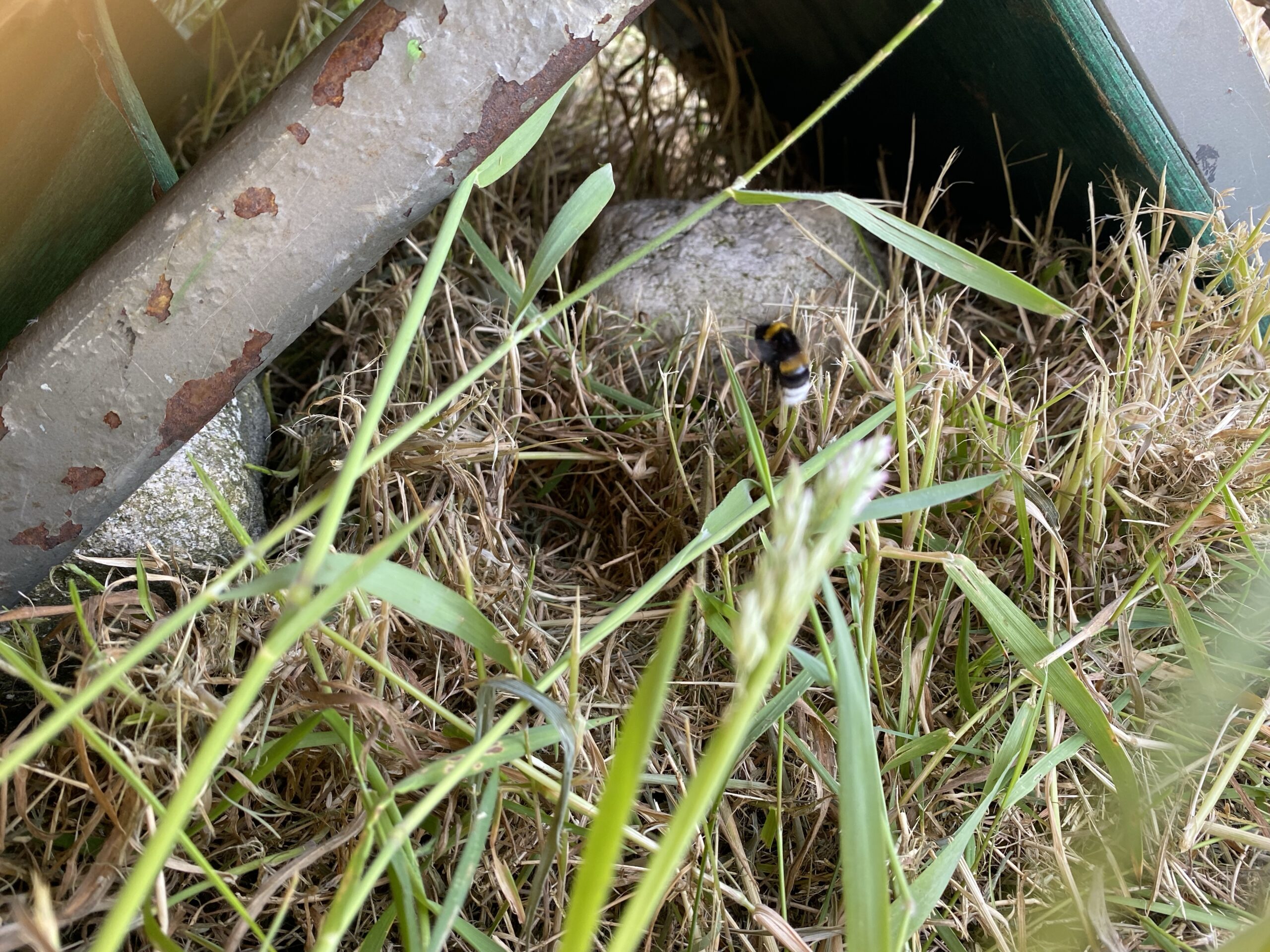 Vor Ort waren tatsächlich zahlreiche Erd-Hummeln am Suchen, offensichtlich war das Einflugloch unter dem hohen abgemulchten Gras nicht mehr zu finden aber zum Glück war das Nest offensichtlich unversehrt, wahrscheinlich in einem ehem. Mauseloch im Boden.