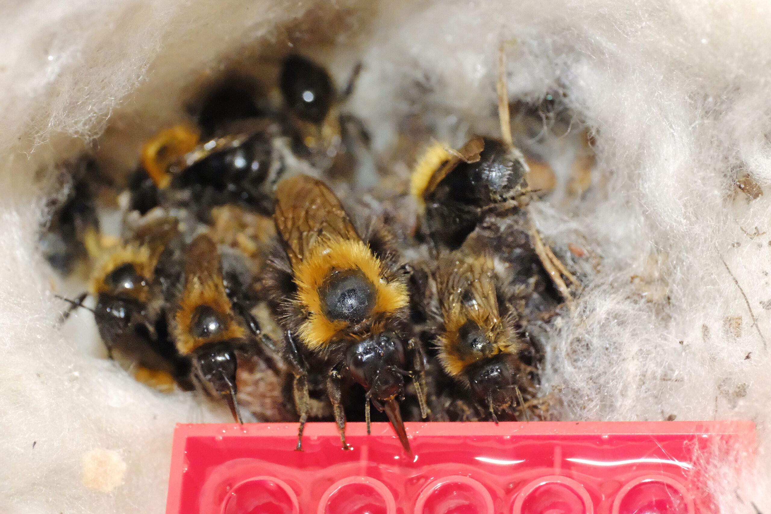 Baumhummel im modifizierten Starenkasten: Geschlechtstiere fliegen. Höhepunkt bereits überschritten.