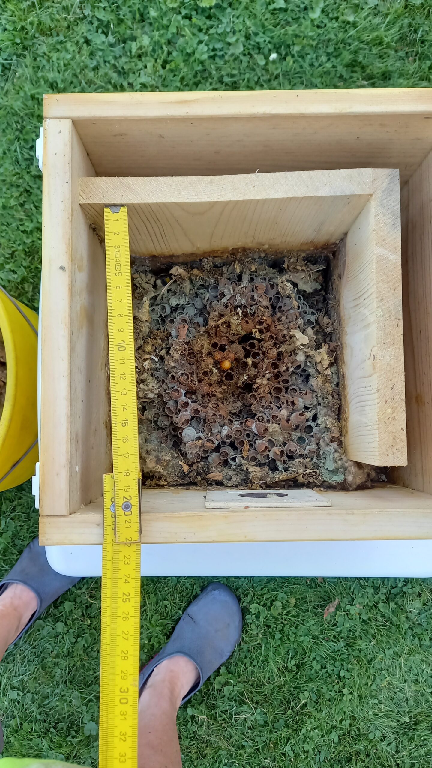 Das Nest war sehr erfolgreich, hat vermutlich mehrere Jungköniginnen und Drohnen hervorgebracht. Vorletzte Woche, um den 18. Juli, nach mehreren Nestkontrollen, war nunmehr dann noch eine Arbeiterin zu sichten.