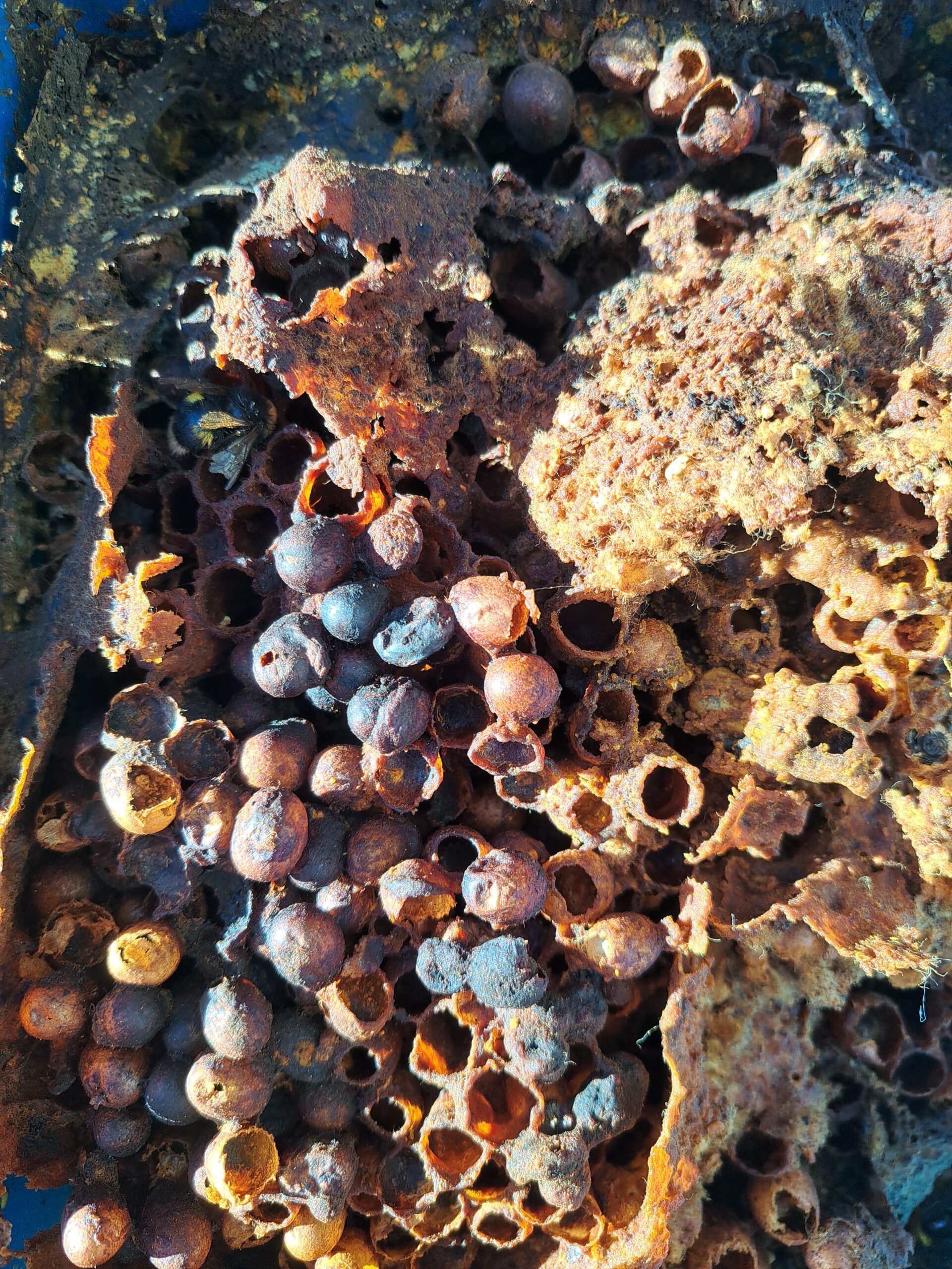 Auch hier bei mir sind noch 3 Völker aktiv. Ein Erdhummelvolk im unterirdischen Eigenbau-Nistkasten mit Arbeiterinnen, die noch fleißig die Tönnchen füllen. Die Altkönigin liegt tot auf dem Nest.