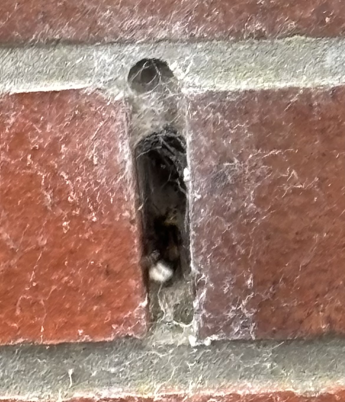 Und heute sah ich Erdhummel-Arbeiterinnen in eine von mir aufgebohrte Fuge in meiner Klinkeraussenmauer fliegen. Die haben es sich anscheinend in der Steinwolle gemütlich gemacht.