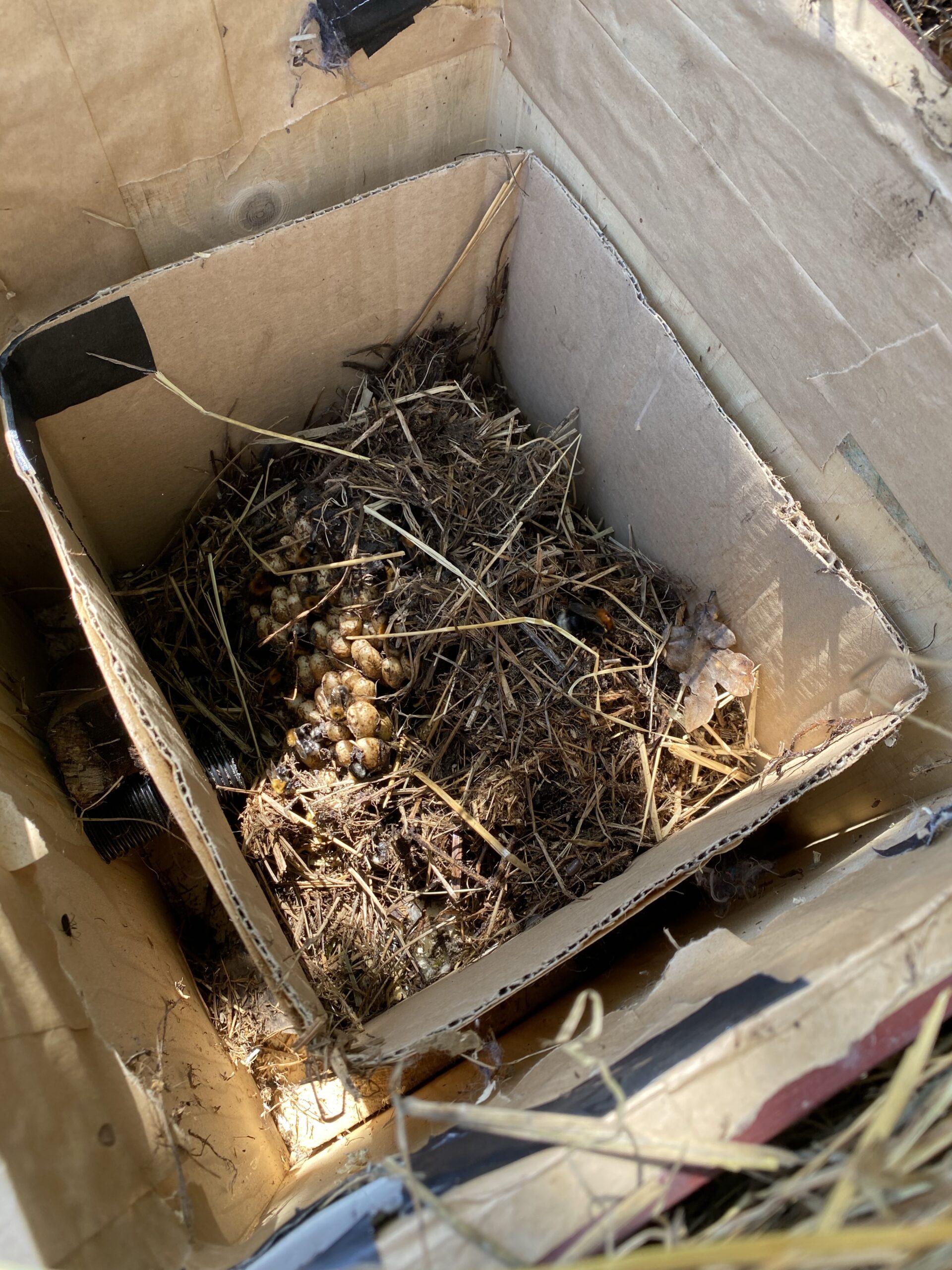 ich hoffe, ich konnte heute ein Hummelvolk zumindest teilweise retten – bekam einen Anruf, dass auf einem Reitstall in der Nähe alte Heuballen entsorgt werden und zwischen zwei Ballen befand sich ein Hummelnest. Anbei ein paar Fotos. Offensichtlich sind auch schon Geschlechtstiere vorhanden. Ich habe das m.E. doch relativ unversehrte aber freiliegende Nest mit zahlreichen darauf sitzenden Hummeln vorsichtig freigelegt und in meinen freien Kopp-Kasten umgesetzt. Es sind Baumhummeln – also mit Imkeranzug und dicken Handschuhen, wurde die ganze Zeit ordentlich umschwirrt, hatte ich mir aber noch schlimmer vorgestellt. Ob ein weiterer Teil des Nestes mit dem davorsitzenden Heu-Ballen zusammen bereits entsorgt wurde, konnte mir keiner sagen, ich kann es schlecht einschätzen. Zumindest scheint es mir aber gelungen zu sein, den Hauptteil der Waben zusammenhängend und in gleicher Ausrichtung umgesetzt zu haben. Den Kasten habe ich zur Hälfte oben auf gelassen, ein bisschen Streu neben die Waben gelegt, so dass die Hummeln die Waben abdecken können. Er steht jetzt noch direkt neben der alten Stelle, die Hummeln fliegen von oben rein. Die Stelle, an der das Nest saß, habe ich auch mit Heu abgedeckt, damit sie dort nicht weiter nach dem Nest suchen. Eine Weile beobachtet, hinzukommede Hummeln suchen kurz, fliegen dann aber relativ problemlos auf das Nest, einige wenige habe ich mit der Pappröhre eingesammelt und ins Nest krabbeln lassen.