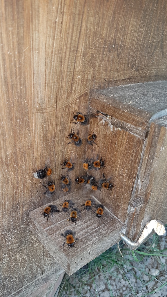 Da habe ich sehr Freude, dass das Baumhummelvolk seine ‘Aufgabe’ geschafft hat und ich eventuell nächstes Jahr wieder welche begrüssen darf. Ich habe sie aus einem Nachbarort umgesiedelt, weil sie dort weg mussten. Sie waren in einen Vogelnistkasten eingezogen der in einem Schuppen stand in dem auch die Kinder ihre Spielsachen hatten. Habe dann auf die schnelle ein Vorbau mit Klappe gebastelt und ihn spätabends gezügelt und modifiziert. Da ich nicht wusste ob und wie die Motte schon zugeschlagen hatte, freut es mich umso mehr! Ich ein habe mal die kleine Serviceklappe am Vogelnistkasten geöffnet um eine Kontrolle zu machen, aber das haben sie mir sehr übel genommen und auch nicht vergessen.