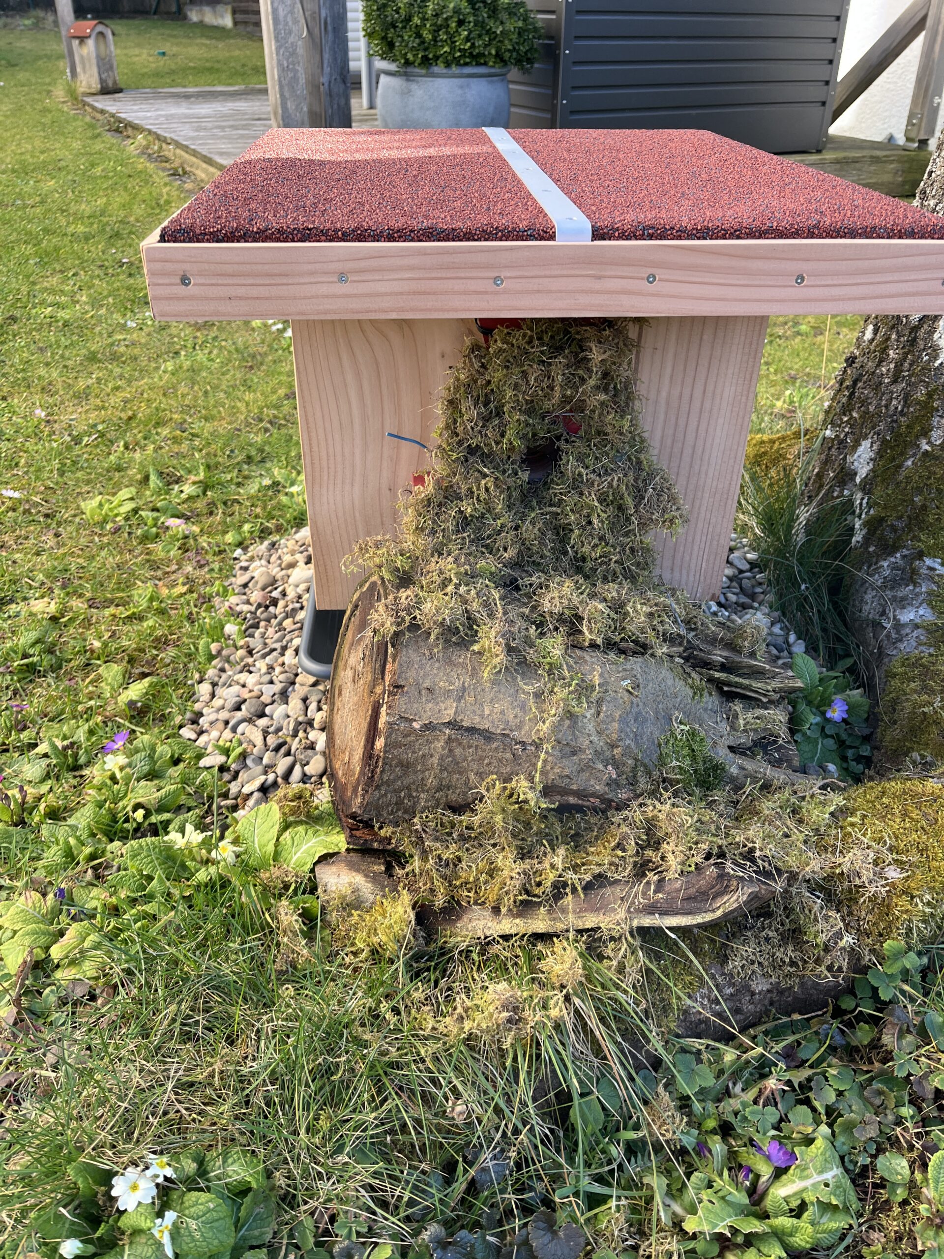 An einem Hummelkasten, natürlich der einzige ohne Kamera, war das Kontrollstöckchen im Eingang umgedrückt – habs nochmal aufgestellt und heute Abend werd ich eine Kamera davorstellen. Vielleicht hat’s schon geklappt ☺️