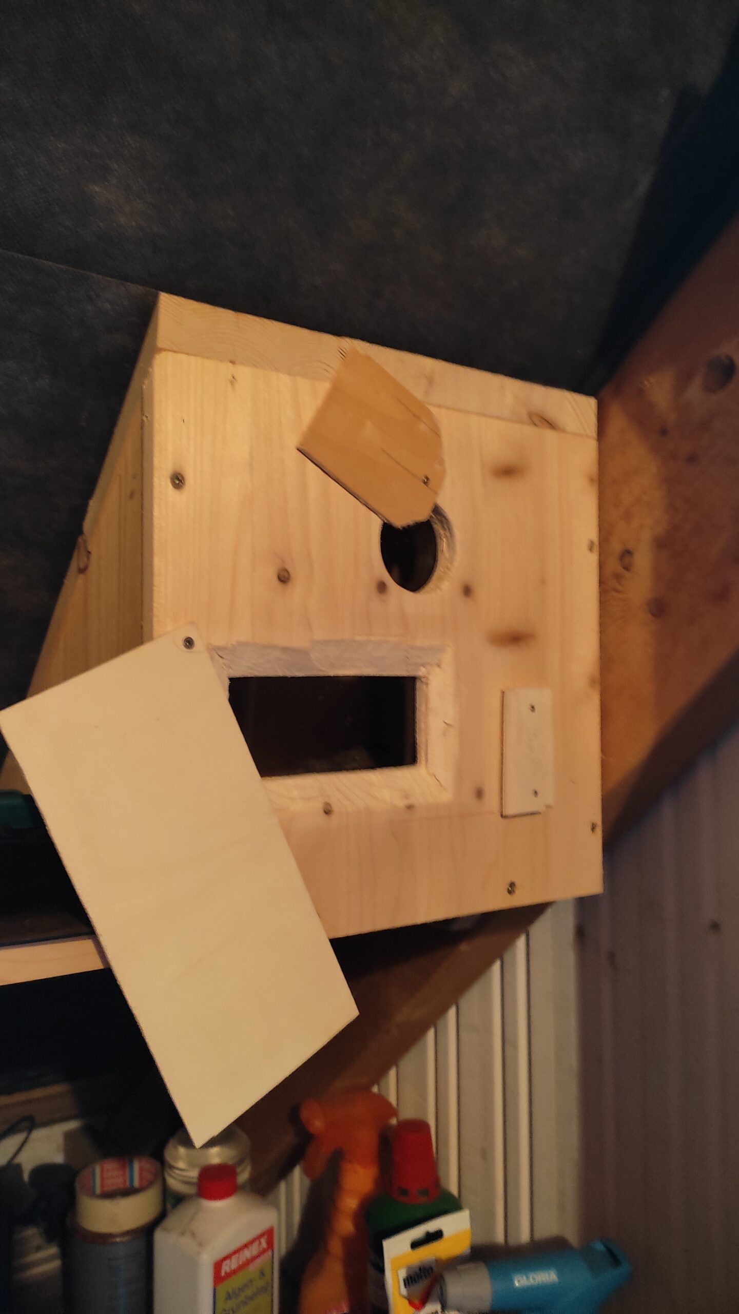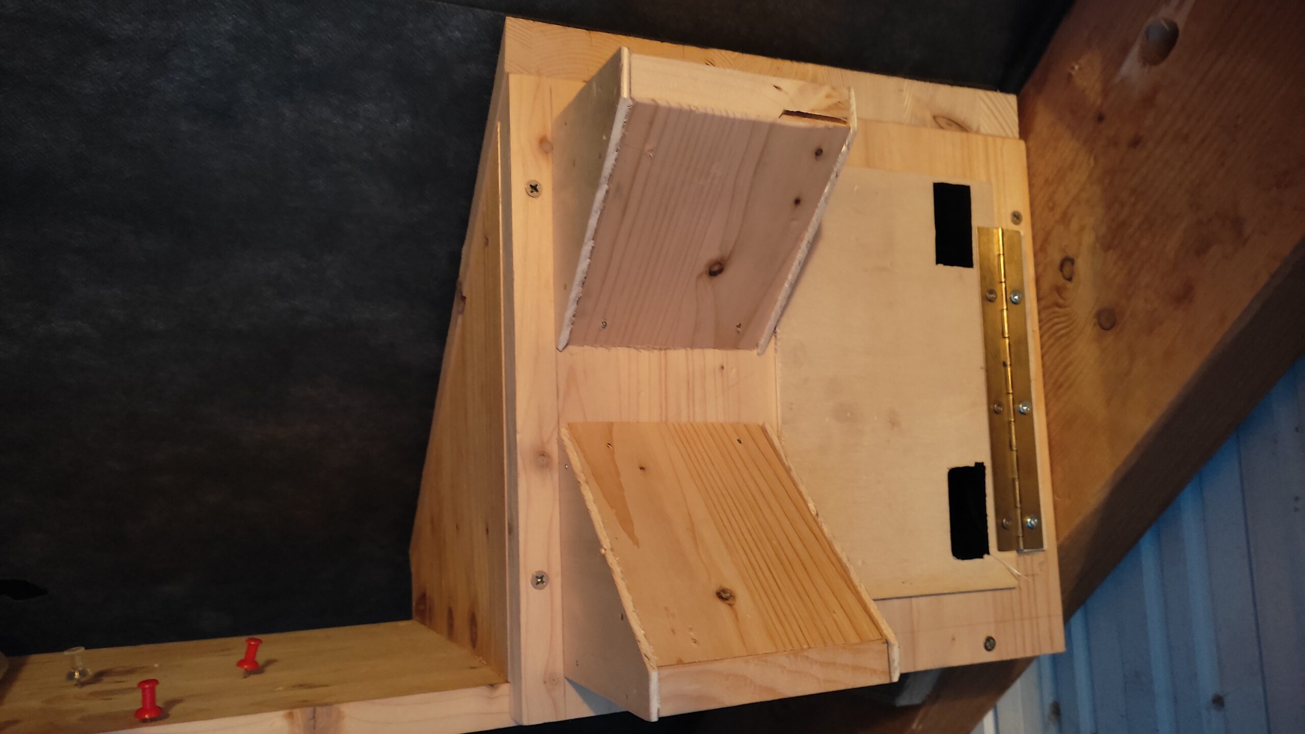 Ich habe meinen Kasten in einen Schuppen in 1,7m Höhe eingebaut, weil dort an der Schuppenwand immer wieder suchende Hummeln zu sehen waren. Also, einfach Loch durch die Wand, Anflugklotz mit Wachsmottenklappe davor und drinnen einen einfachen Kasten mit zwei Lagen Füllstoff und ausserdem zwei Fenster mit Abdeckung davor.
