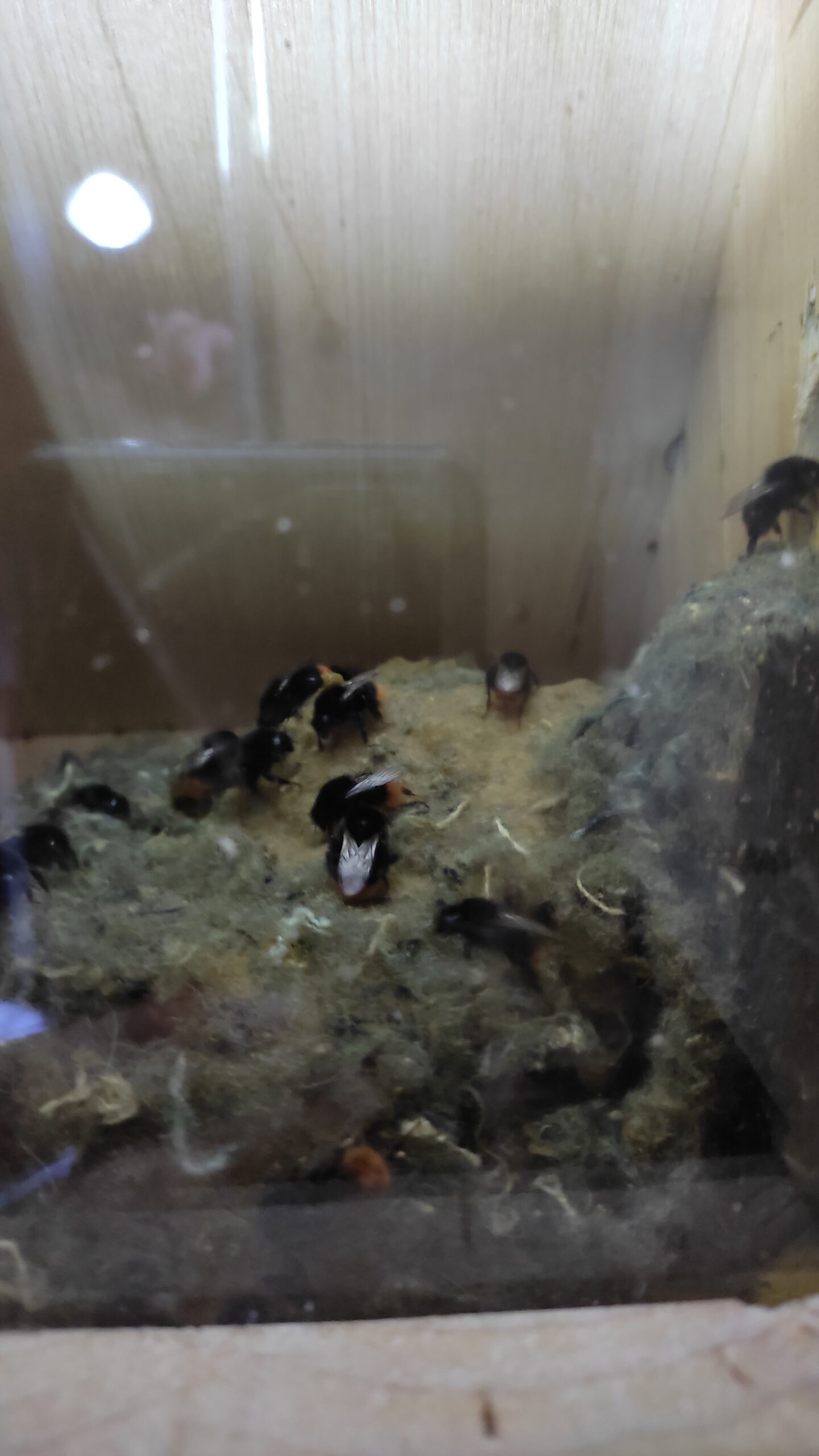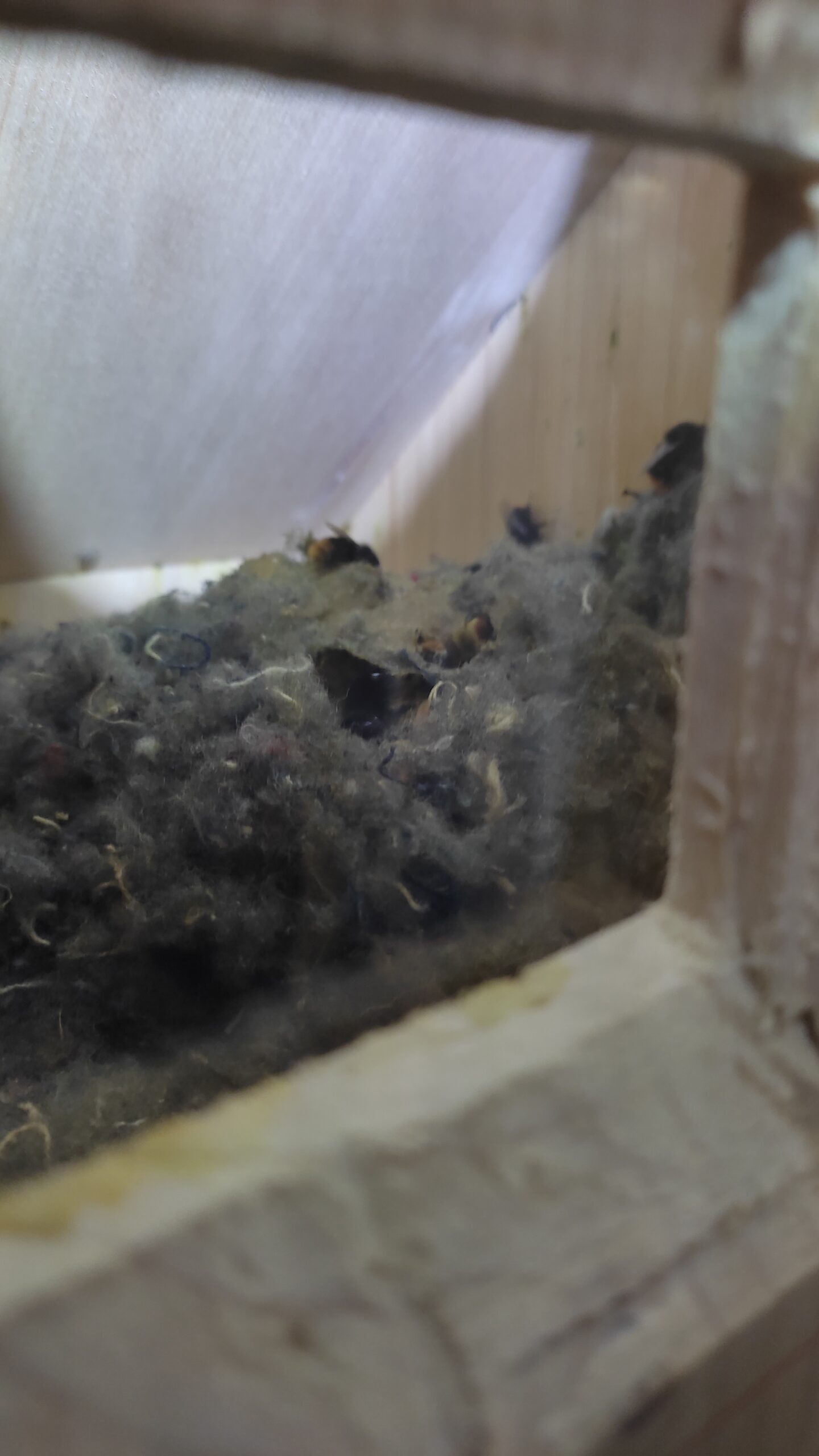 Heute ein Rückschlag. Zwei tote Hummeln unter dem Eingang und im Nest eine Menge sichbare Hummeln – das war vorher nie so.