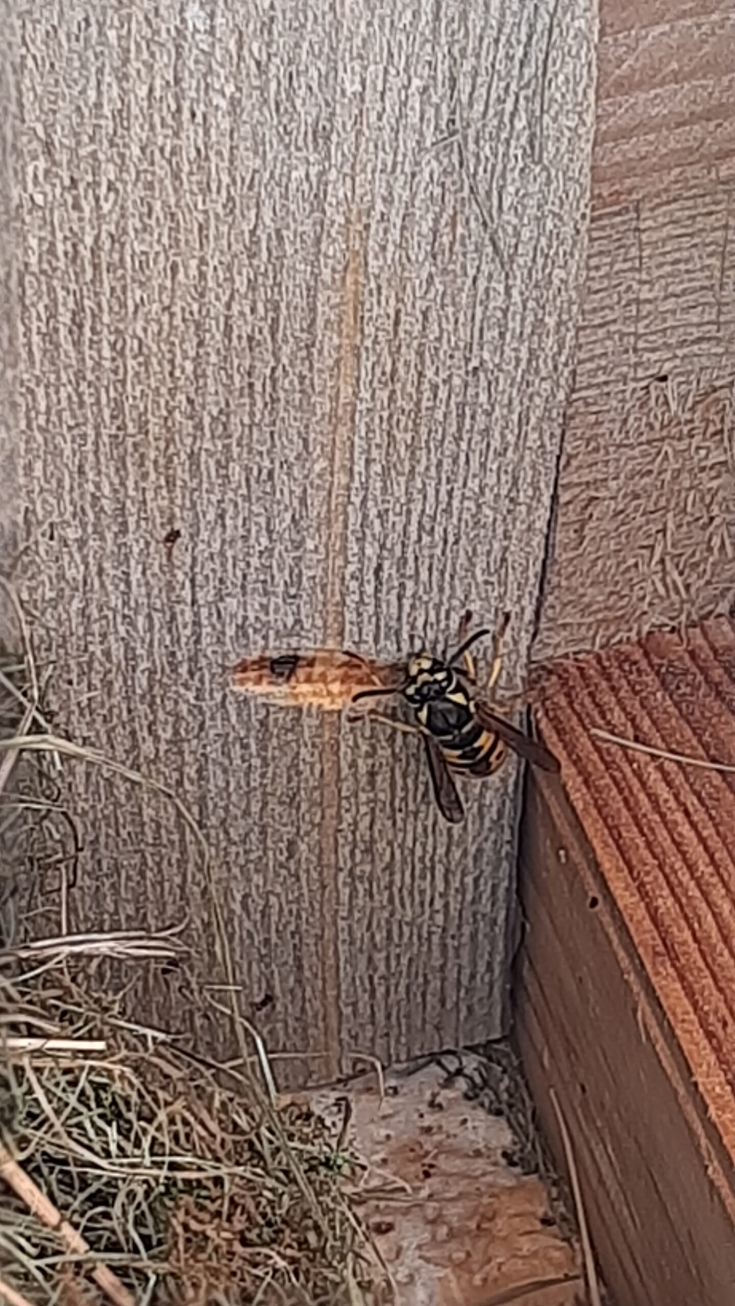 Im zweiten Hummelkasten unterm Kirschbaum wohnten zwischenzeitlich 3 Wespenköniginnen. Es handelte sich um 2x Deutsche Wespe und 1x Gemeine Wespe. Keine von von ihnen machte Anstalten ein Nest zu gründen. Mittlerweile ist nur noch die Gemeine Wespe da, sie macht früh und abends kurze Ausflüge und ruht die restliche Zeit auf der Einstreu. Ich weiß nicht was ich davon halten soll.