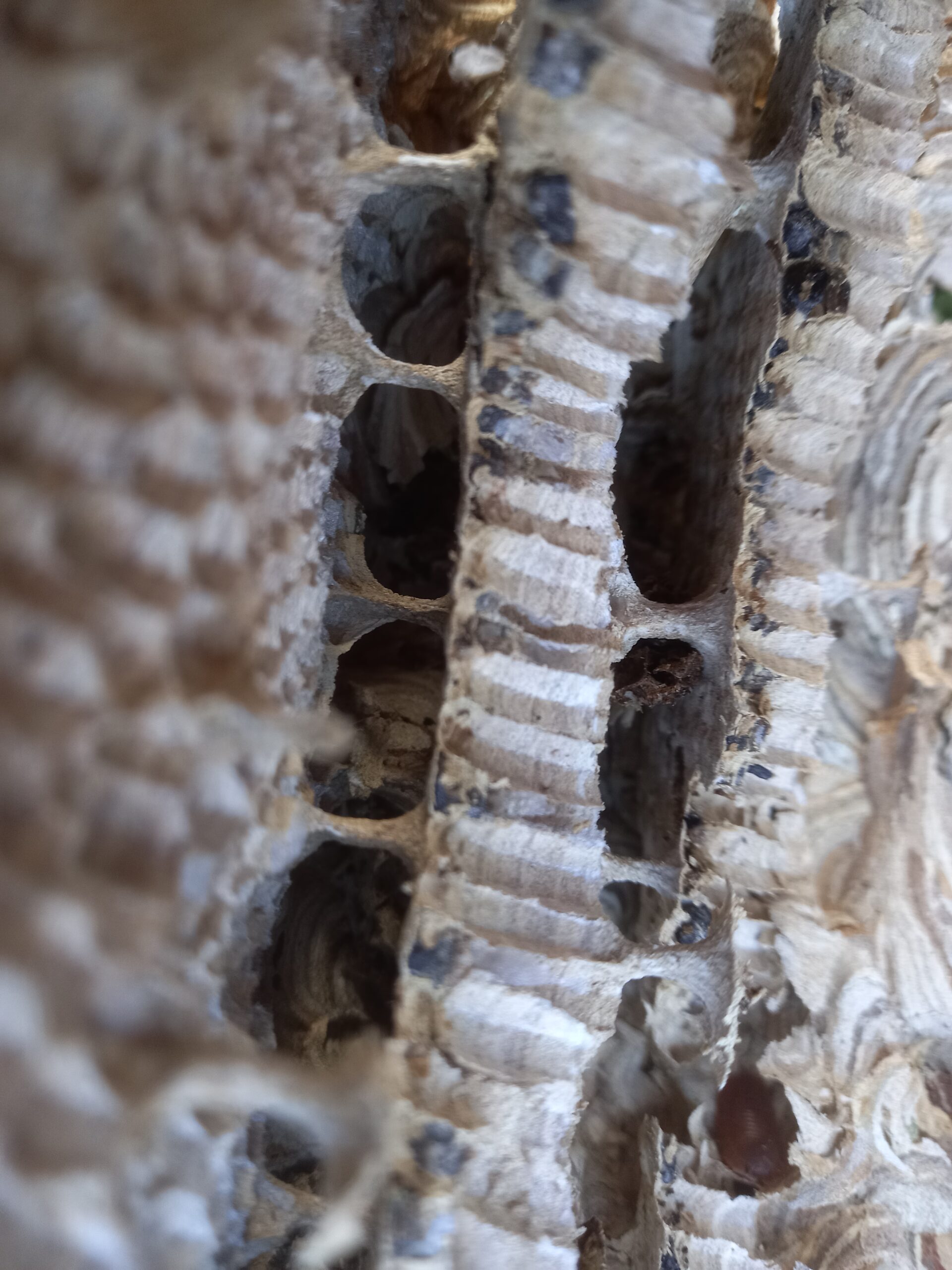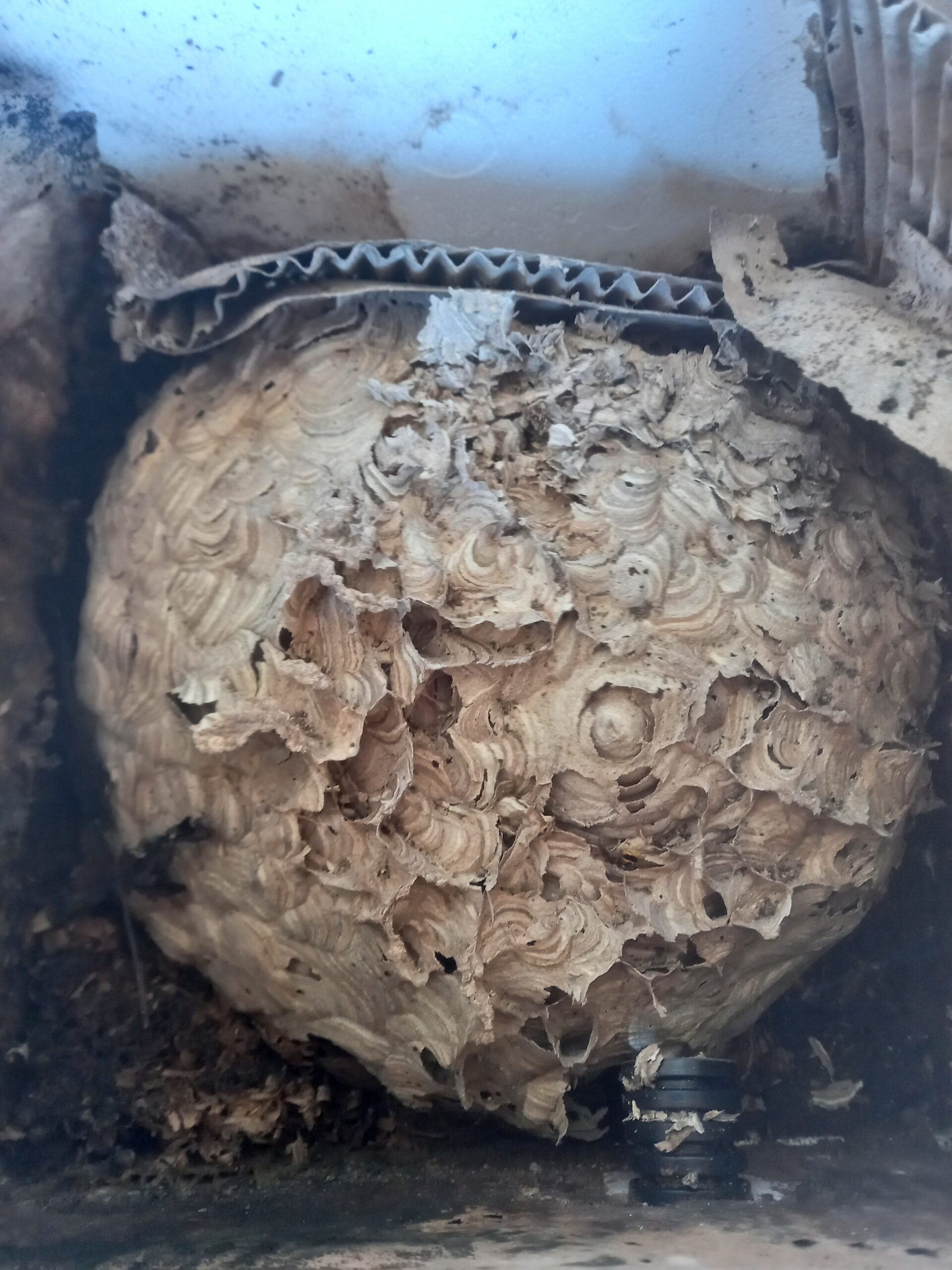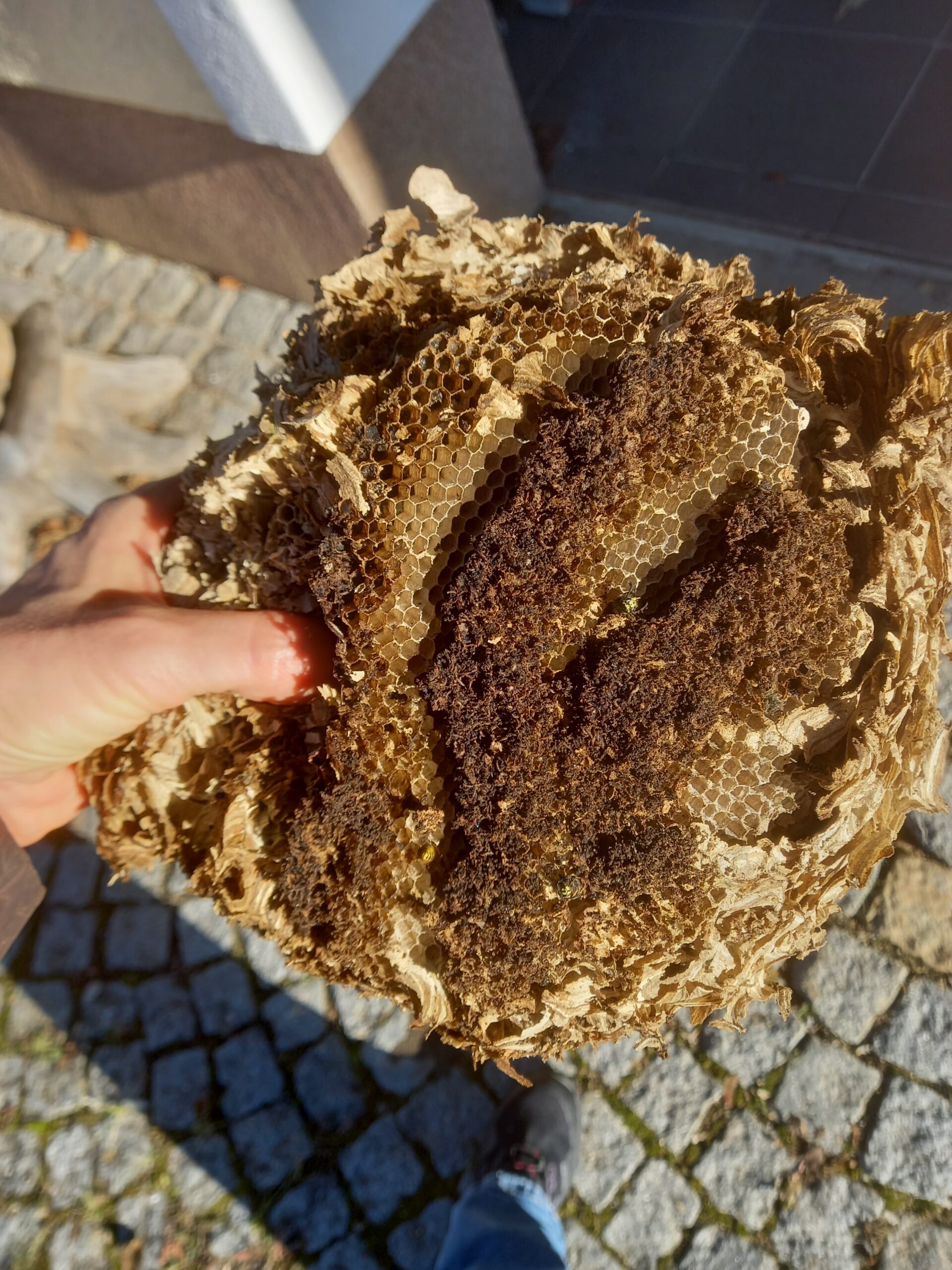 Habe heute einen Hummelkasten zur Inspektion ins Haus geholt und das erste Mal das nun aufgelassene Wespennest gesehen.