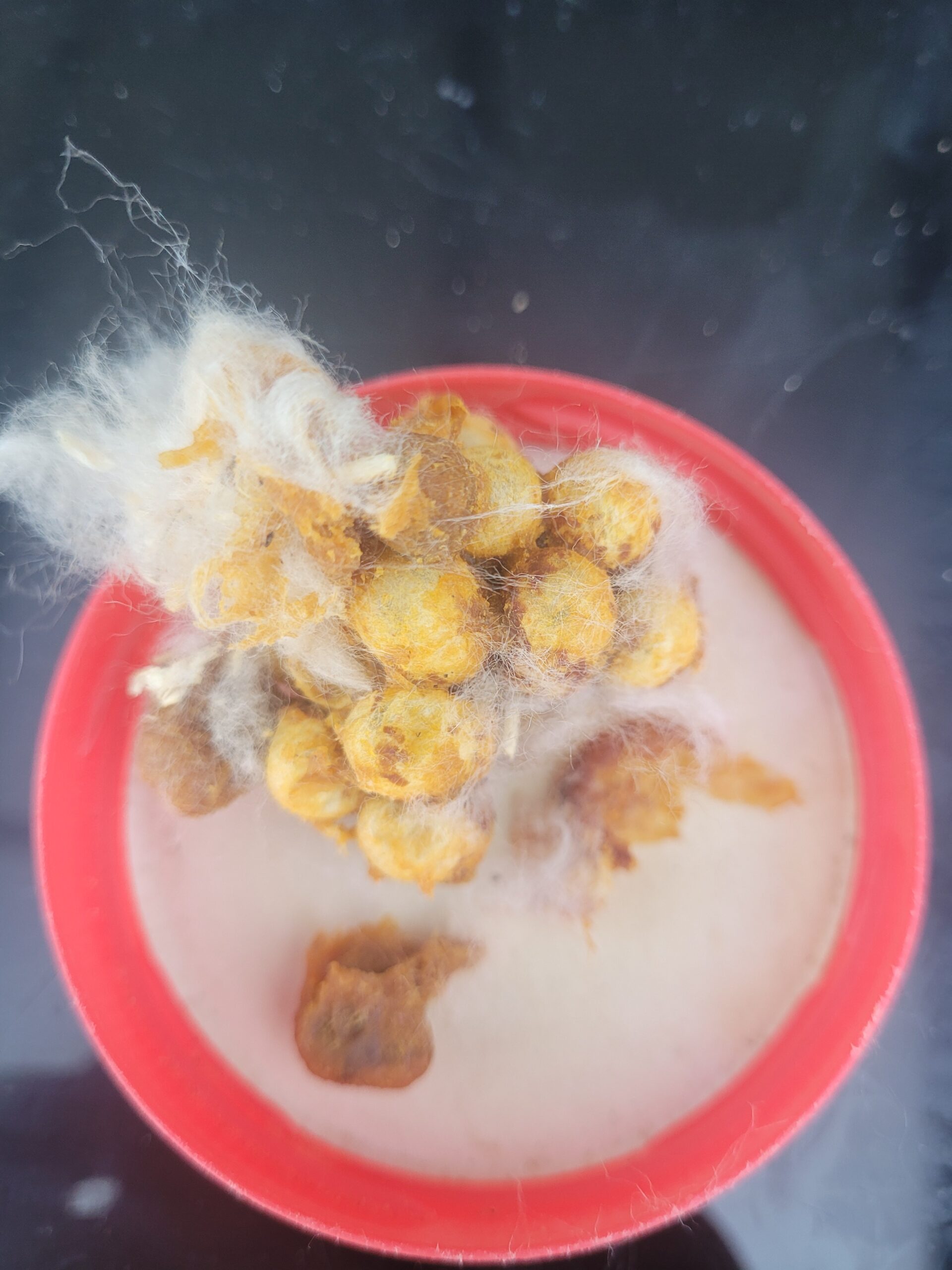 …..wieder nur mehr 2 Arbeiterinnen im Kasten, die aber auch nicht ausfliegen d.h. die Königin macht das immer noch allein u. es ist auch nur ein Mini-Larvenknäuel vorhanden. Ich bin hier echt etwas ratlos u. frage mich, ob ich außer mit Zuckerwasser noch zusätzlich irgendwas tun kann, damit das Volk endlich Fahrt aufnimmt u. wächst