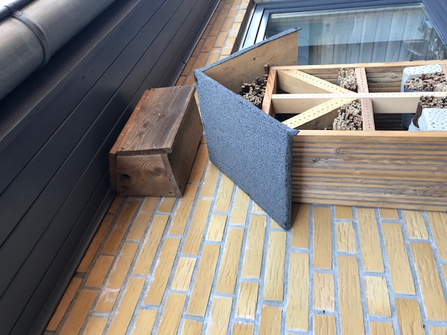 Doch seit 4 Tagen fliegen eine dunkle Erdhummelkönigin gezielt meine Spatzenkasten rein u. raus – wenigsten eine Besiedlung (siehe Photo) aber halt nicht optimal da an d. Südwand u. ohne Lüftung – aber im Schatten unter d. Dachaushang.