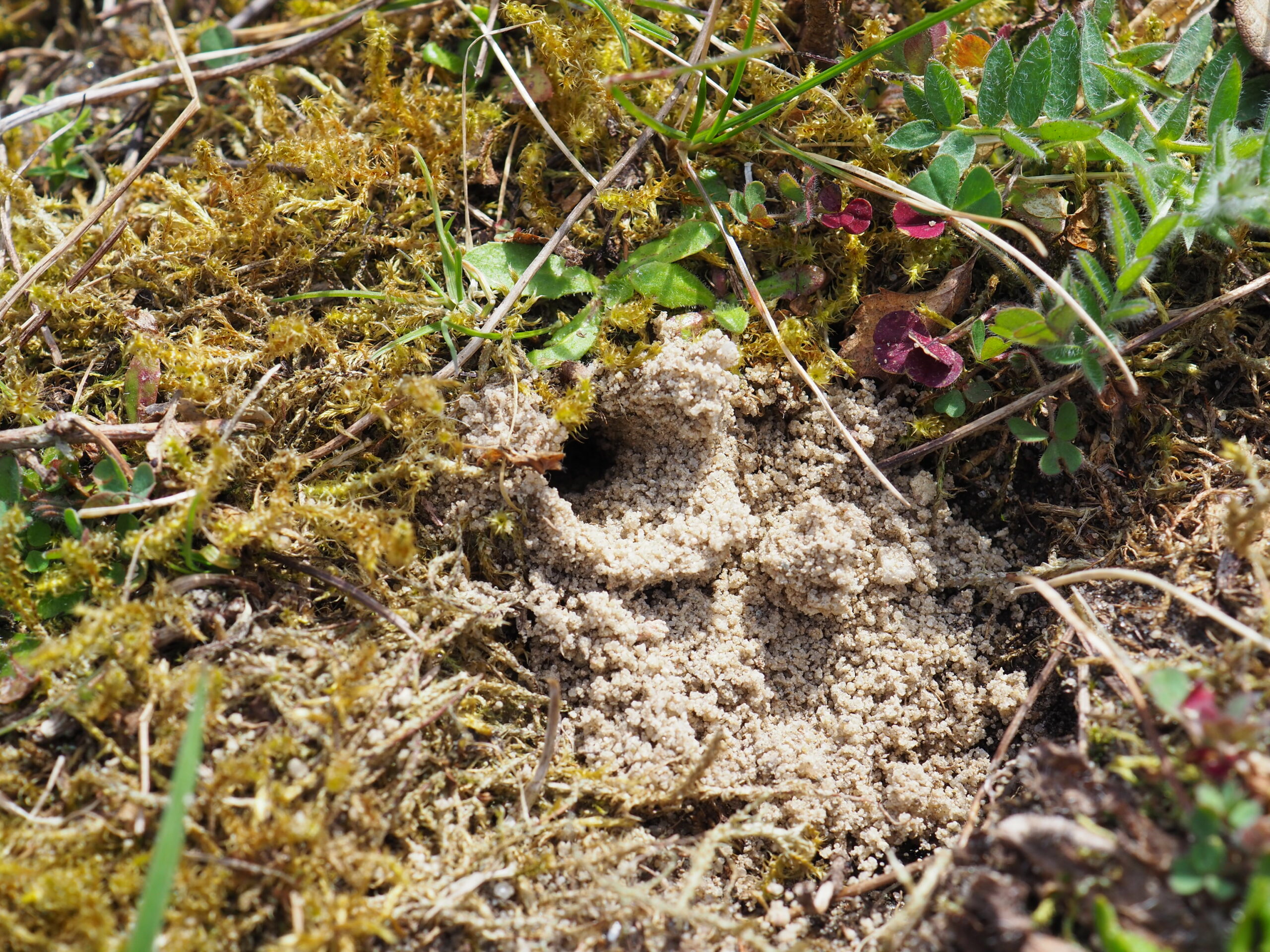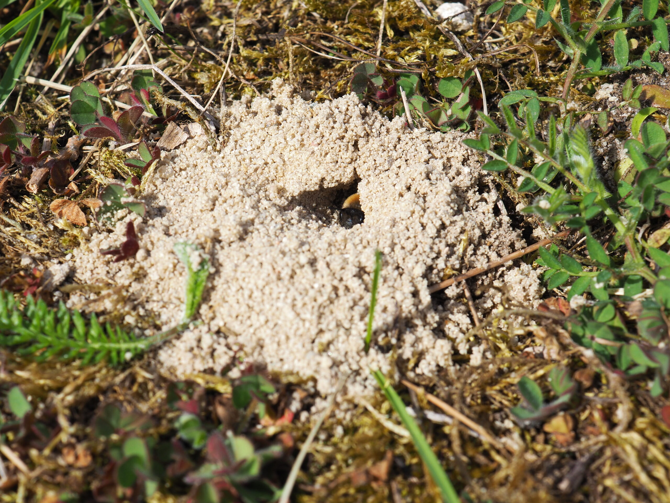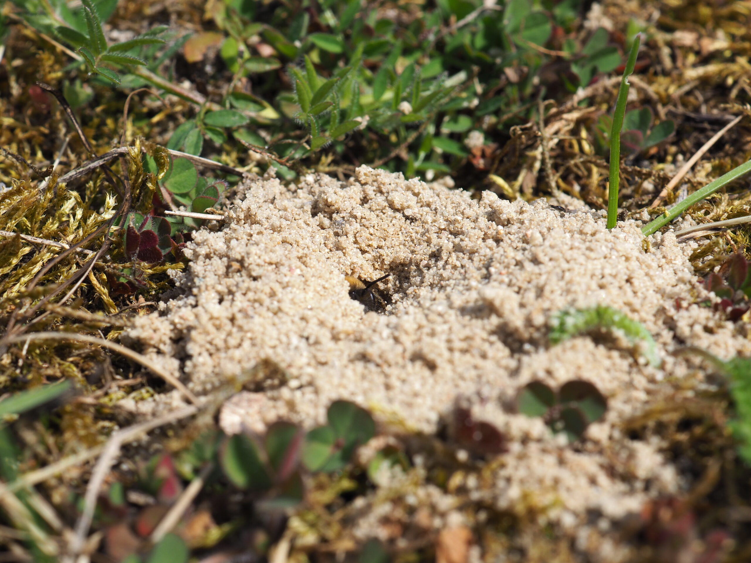 die sandbiene nistet immer auf kahlen stellen auf dem rasen bei uns, die entstehen immer wegen der Trockenheit.Ja, ich konnte auch immer beobachten wie die sandbiene/ seidenbeine aus ihren löchern immer erde nach oben geschoben hat