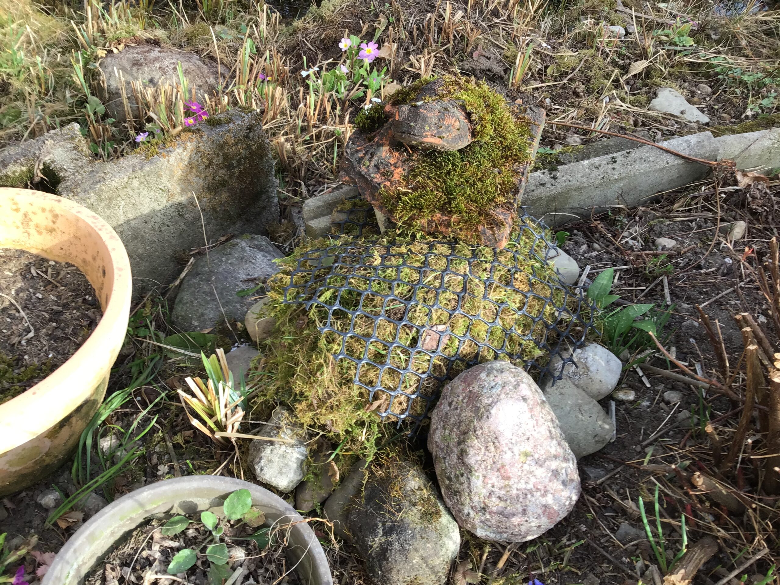 Die ganzen Moosstücke lege ich auf den Boden, das lose Moos und Gras zusammen gedrückt oben drauf. Dann gegen zu viel Regen leicht schützen und auch gegen nachtaktive Tiere, wie z.B. Igel. Da sind der Fantasie keine Grenzen gesetzt.