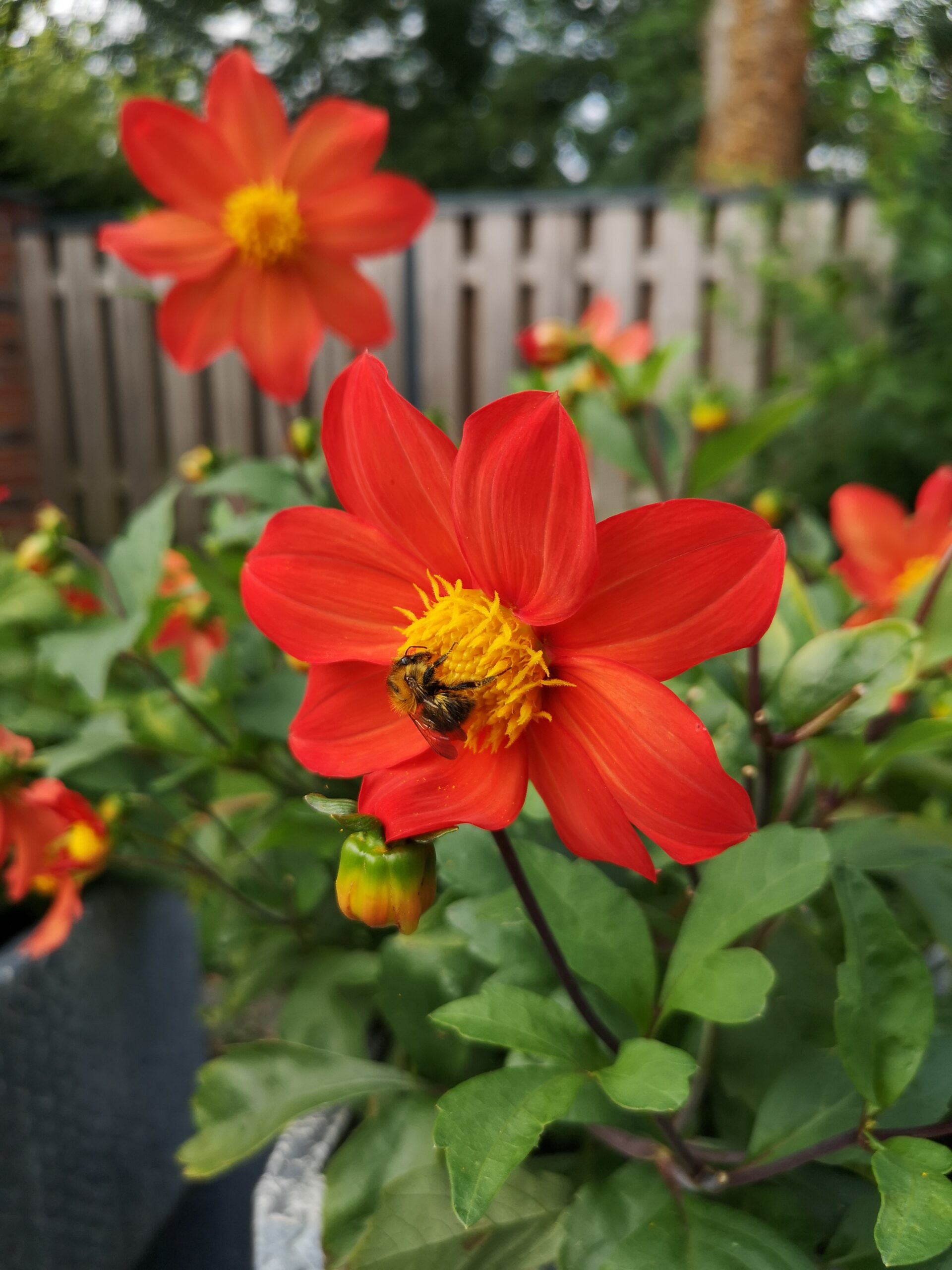 Malven sehen anders aus (s. Bilder). Dafür interessieren sich “meine” Hummeln gar nicht. Verrückt sind sie nach meinen orange-farbenen offenen Dahlien. Die ziehe ich jedes Jahr neu aus den im Herbst ausgebuddelten Knollen. Inzwischen 28 Stück. Und wegen evtl. Schnecken nur in Kübeln.