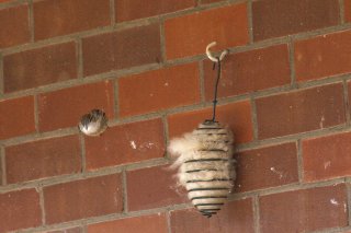 das hat mich daran erinnert, dass ich im letzten Jahr auch Kapok rausgehängt habe. Also flugs aufgefüllt – und heute war es schon leer. Also nochmal nachgelegt – und geschaut, wer sich bedient. Hier sind es die Haussperlinge. Unterschiedlich die Vorgehensweise nach der Entnahme. Entweder gleich ab in die Hecke. Oder passend machen. Da sich aktuell eine Blaumeise für den Kasten interessiert, habe ich das Kapok einen Haken weiter gehängt.